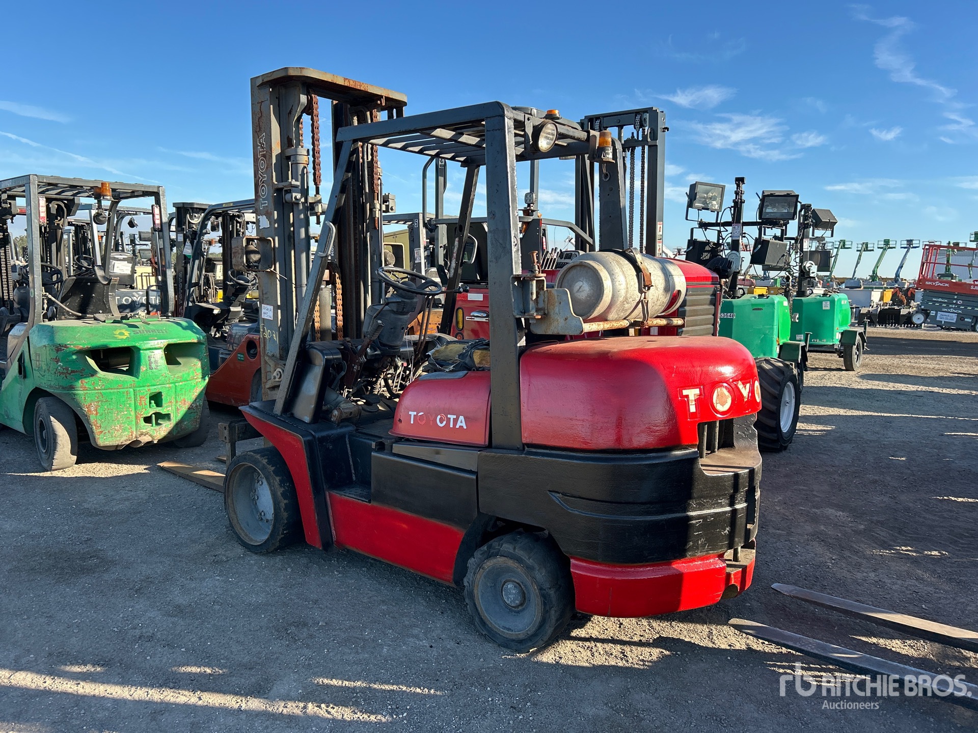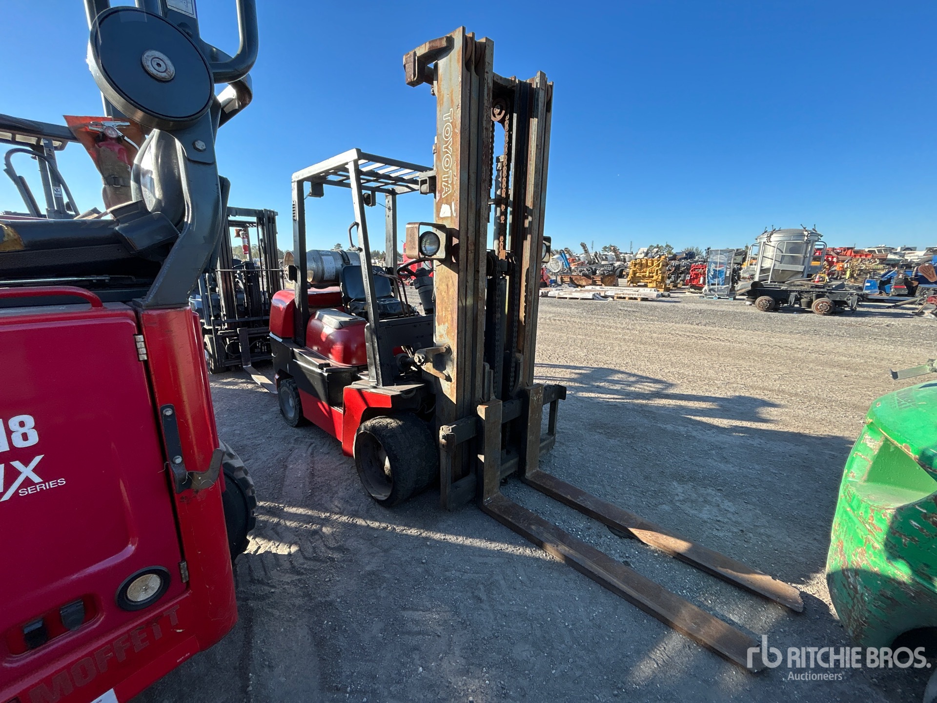 3 Stage Mast, 98.5 in Max Lift Height, 97 in Lowered Mast Height, 52 in Forks, 8 Cylinder LPG Engine