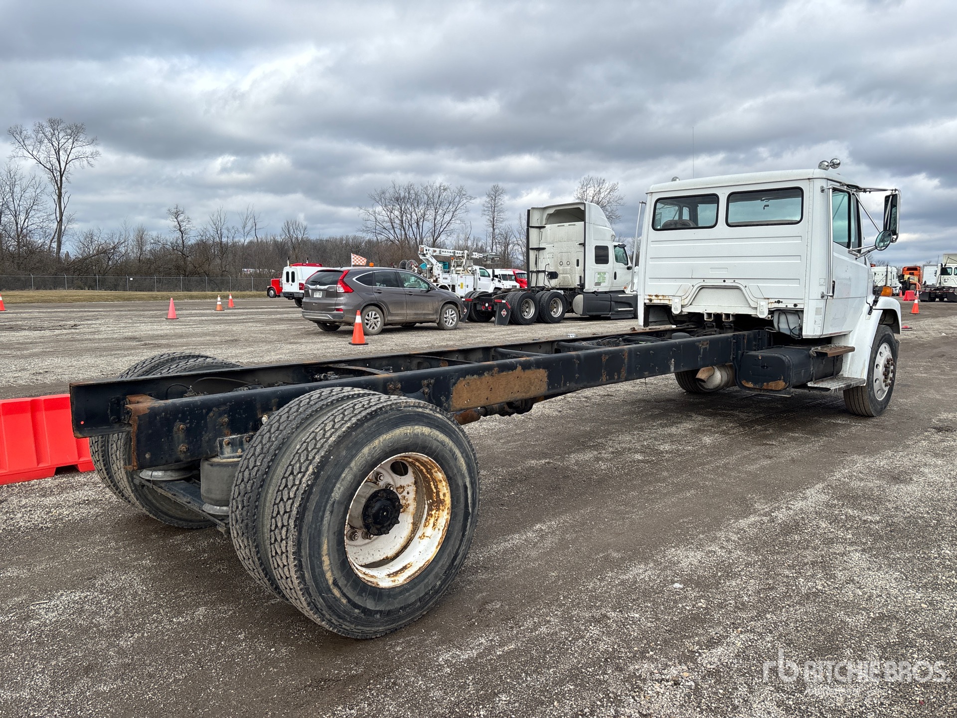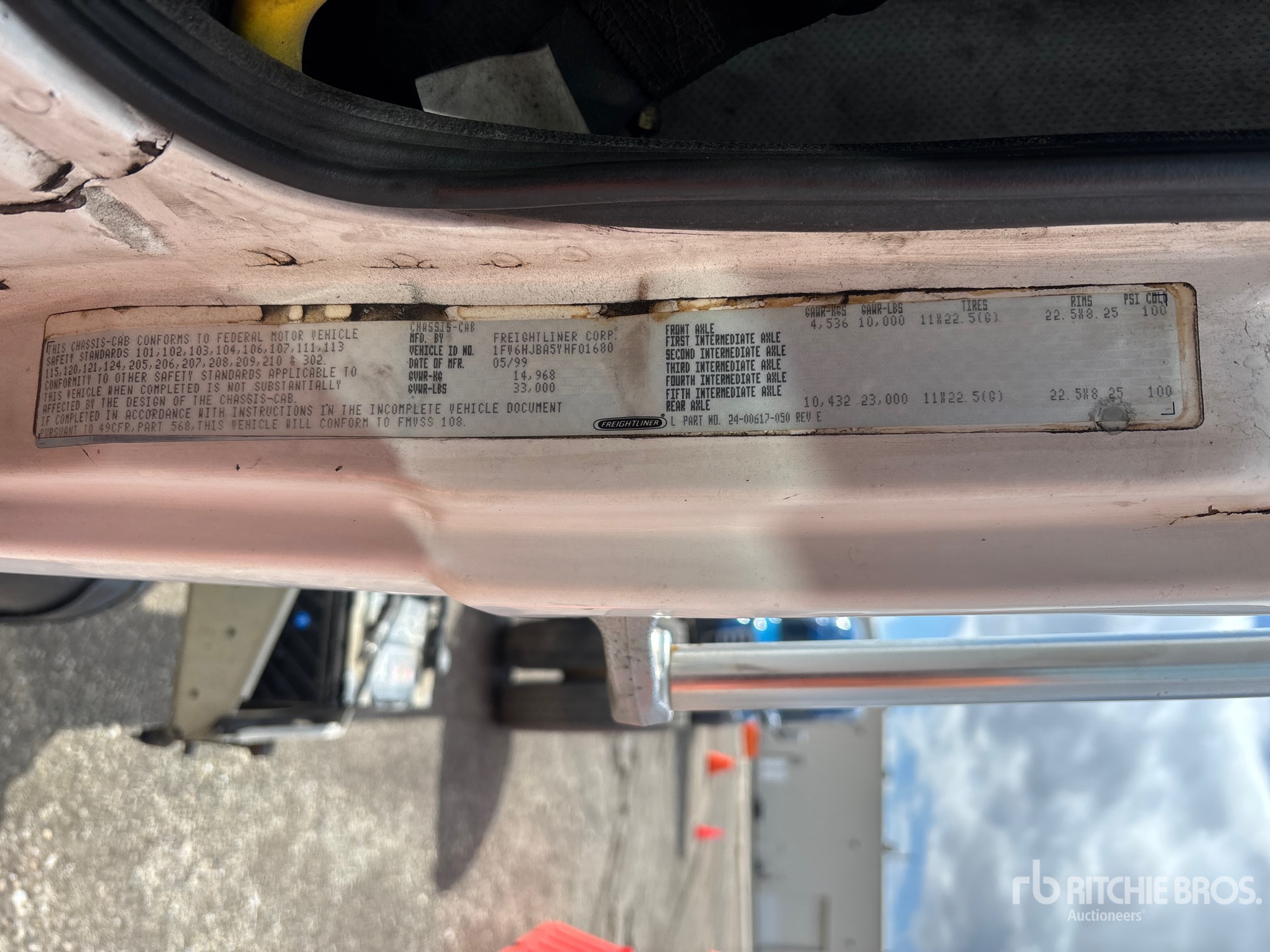 Cat 3126 6 Cylinder 7.2 L Diesel 250 hp Engine, 1999 US EPA Label, CARB Compliant, Eaton Fuller RTF8709B 9-Speed Manual Transmission, 10000 lb Front Axle, 23000 lb Rears, Meritor RS-23-160 Drive Axles, 3.91:1 Axle Ratio, 33000 lb GVWR, Aluminum Front Wheels, 285/75R24.5 Front Tires, 11R22.5 Rear Tires, Airliner Air Ride Suspension, 270 in Wheelbase, PTO, 205 in Cab to Axle, 238 in Cab to End of Frame