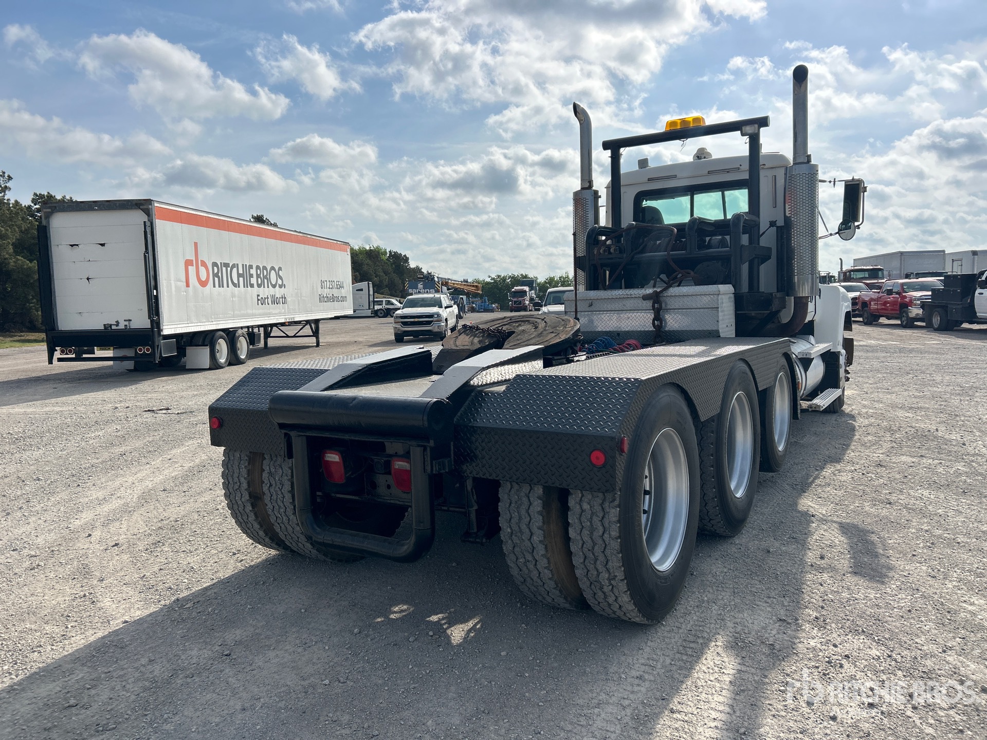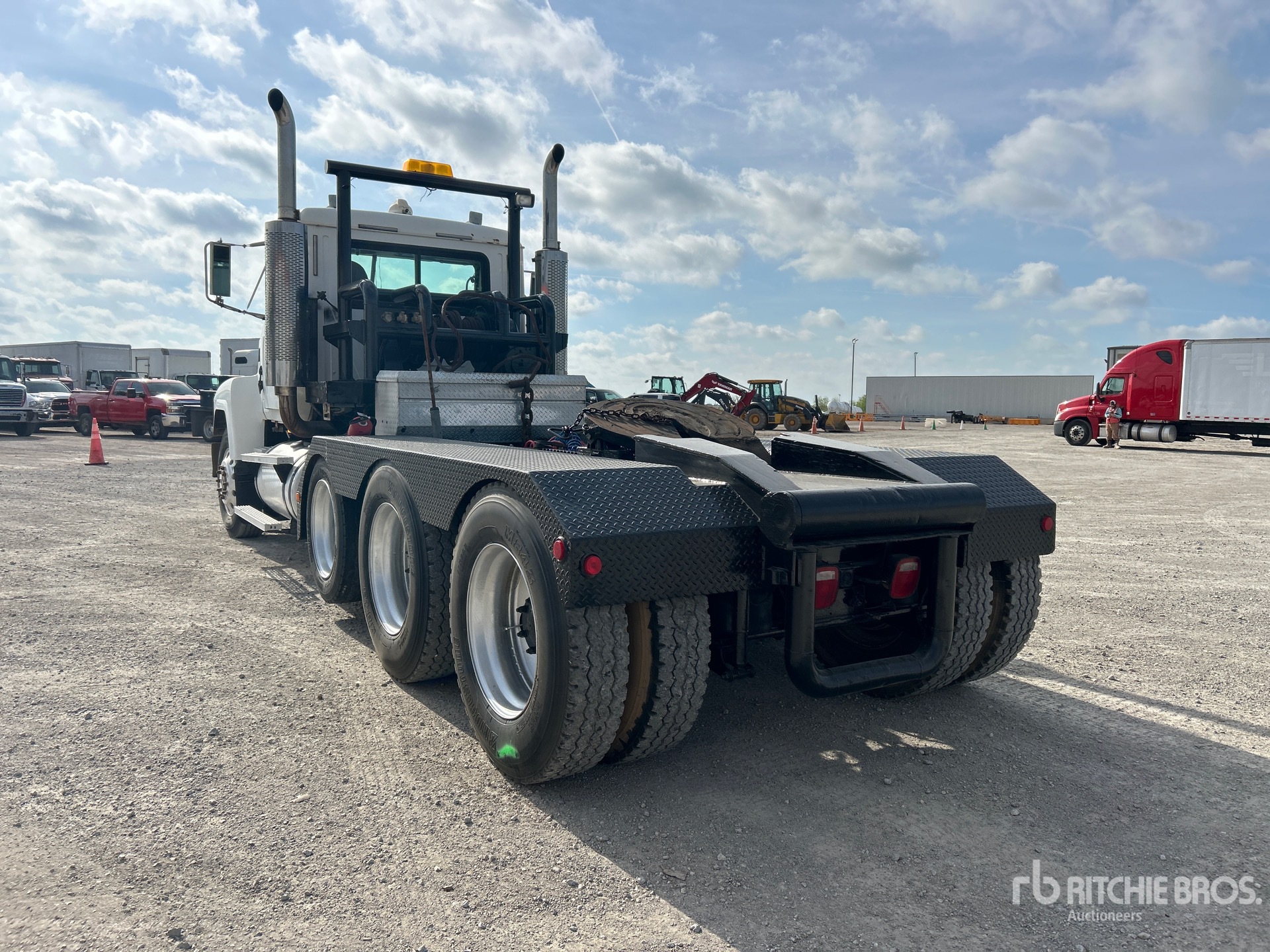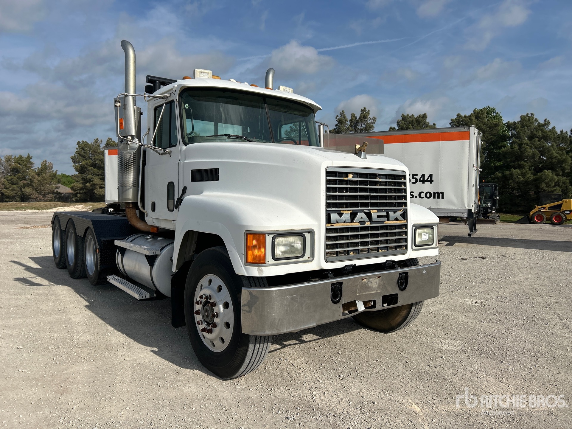 Located in Lane 48 Spot 7, Mack E7-460 6 Cylinder 11.9 L Diesel 460 hp Engine, 2000 US EPA Label, 18728.6 Engine hrs, Engine Brake, Mack T2180 18-Speed Manual Transmission, 12860 lb Front Axle, 44000 lb Rears, 56860 lb GVWR, Aluminum Wheels, 11R24.5, Air Lift Pusher Axle, mRide Air Ride Suspension, 16 ft x 96 in Bed, Tail Roll, Tula winch Winch, Lowboy Ramps