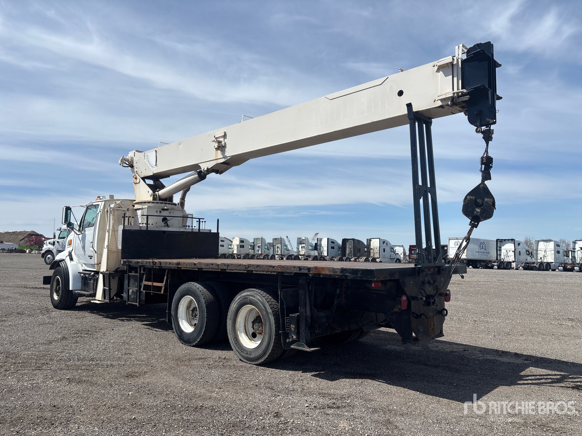 Cat C10 6 Cylinder Diesel Engine, 24242 Engine hrs, 8LL Manual Transmission, 20000 lb Front Axle, 40000 lb Rears, 60000 lb GVWR, 425/65R22.5, Hendrickson Spring over Walking Beam Suspension, 259 in Wheelbase, PTO, 27 ft - 90 ft 4 Section Boom, 1 Sheave Hook Block, Dual Controls, Rear Outriggers, 5th Outrigger, 20 ft x 96 in Bed