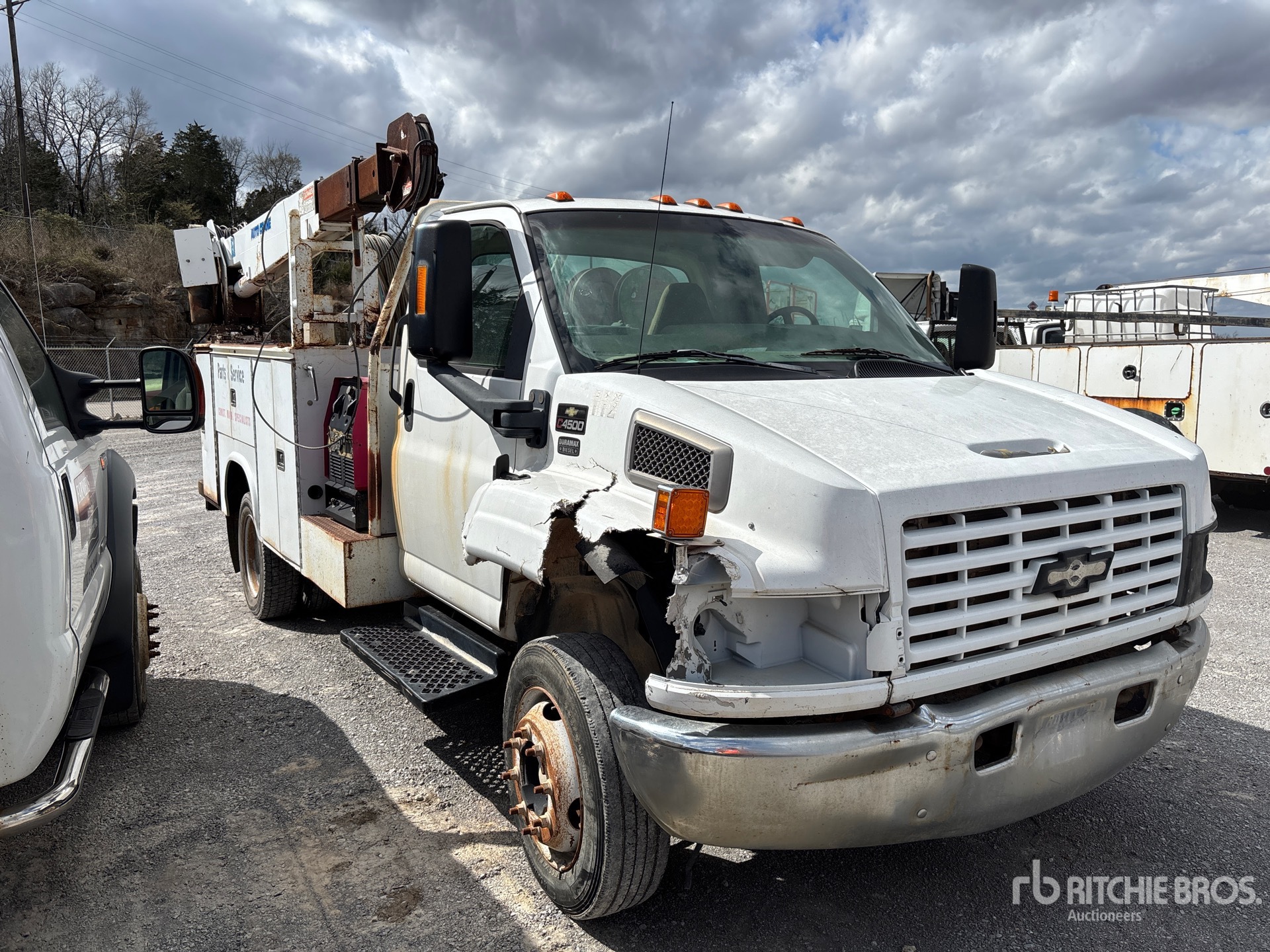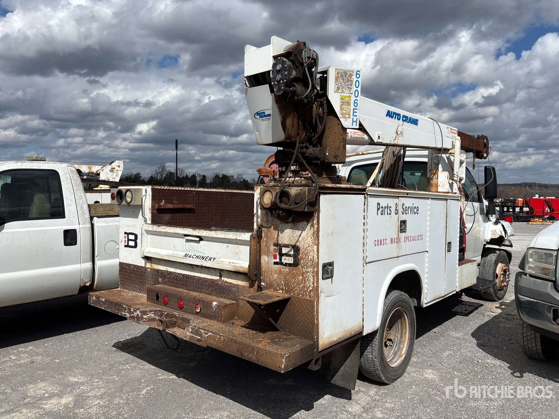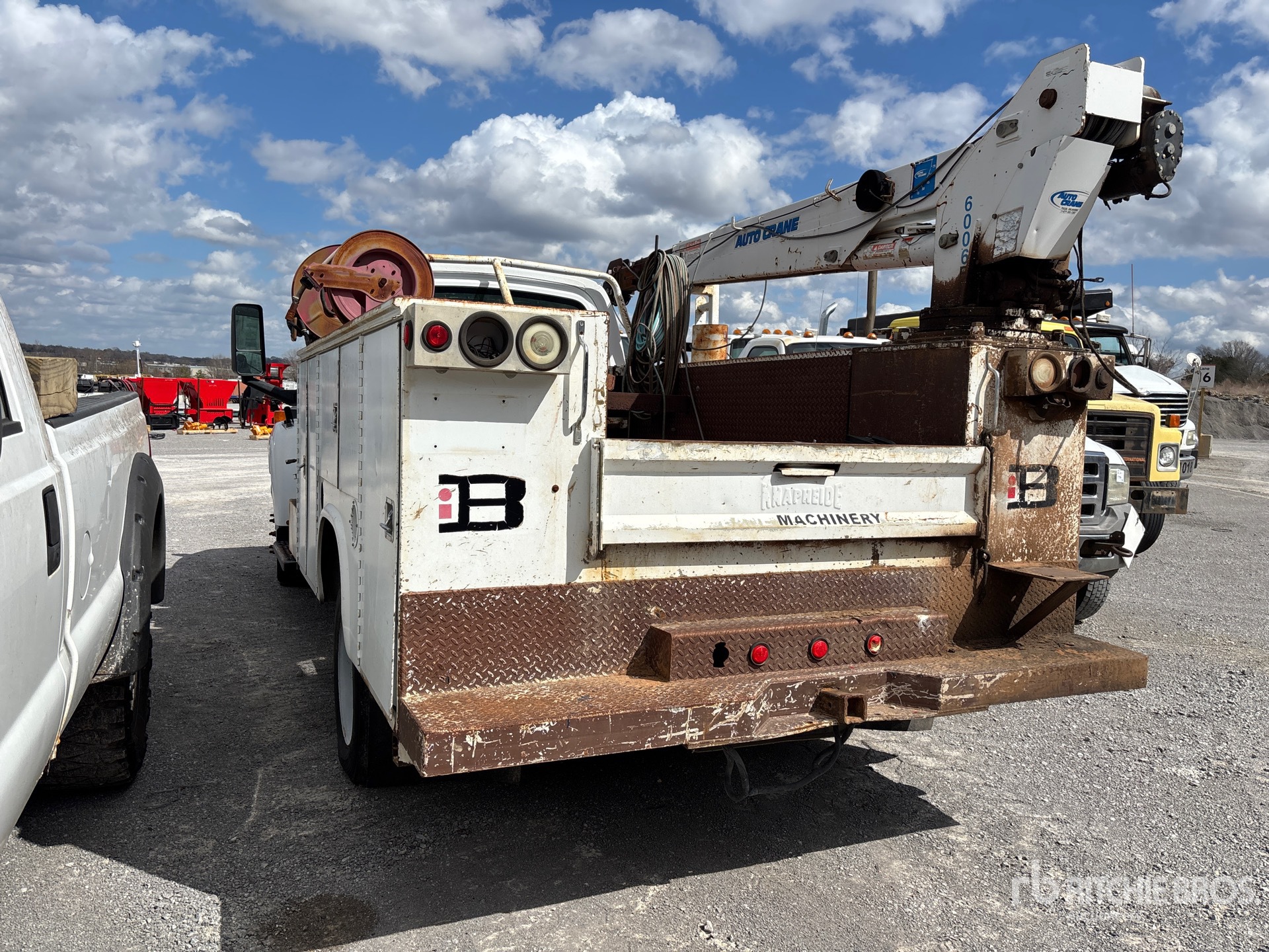 V8 Gasoline Engine, Automatic Transmission, 6250 lb Front Axle, 11000 lb Rears, 16000 lb GVWR, 225/70R19.5, Spring Suspension, 198 in Wheelbase, 9 ft Body, Auto Crane 6006EH 6000 lb 3 Section Electric Crane, Wired Remote Control, Ingersoll-Rand Gasoline Air Compressor, Air Hose Reel, Lincoln Welder
