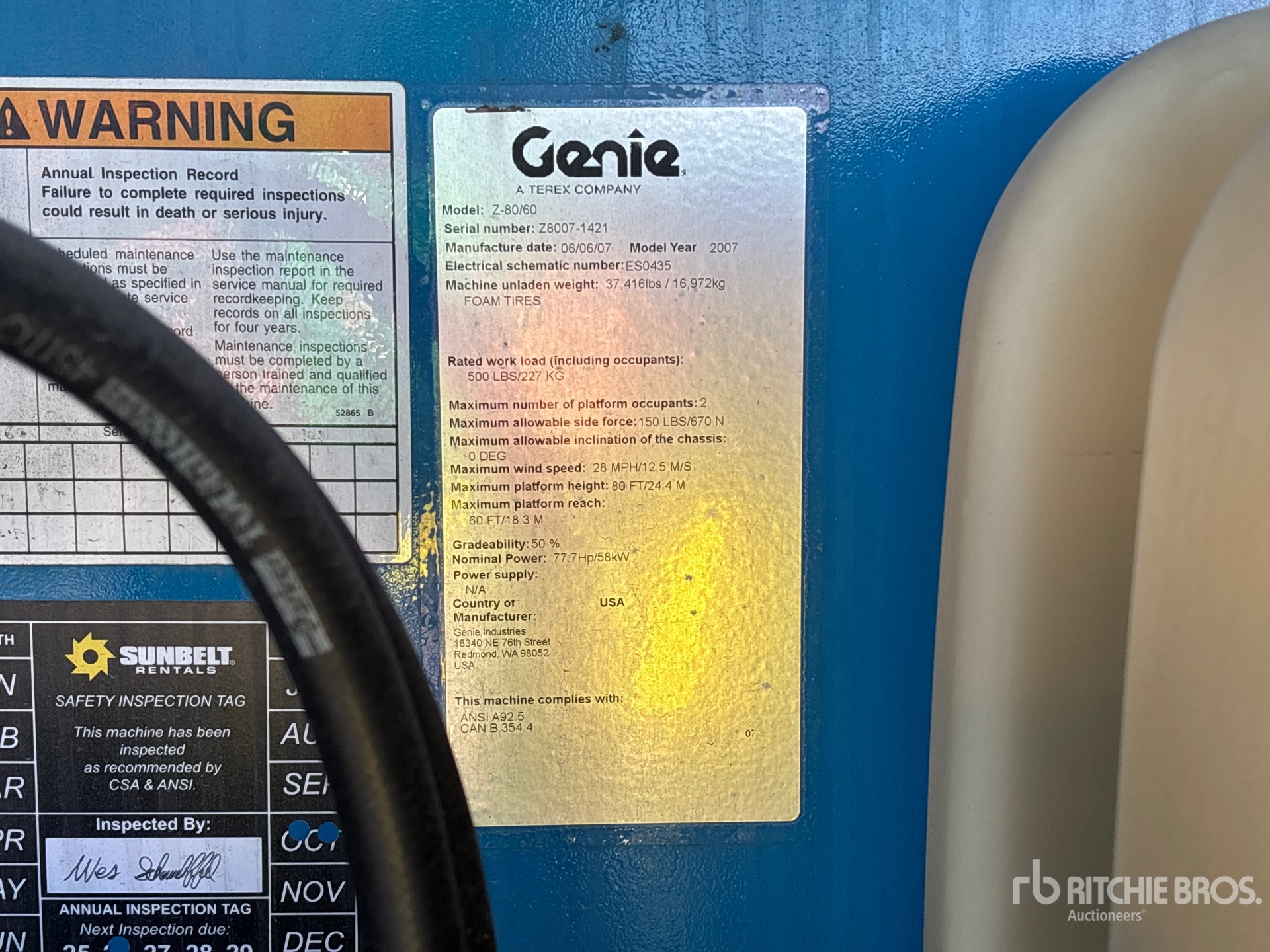 L'équipement n'a pas été testé avec charge ou utilisé dans toutes les situations applicables. Nous ne garantissons en aucun cas le bon fonctionnement de l'équipement conformément aux spécifications du fabricant. Aucune inspection n'a été effectuée pour vérifier tout aspect fonctionnel, sauf indication expresse dans le présent document. Seule une sélection de photos des composants individuels du train roulant sont à disposition, et peut ne pas indiquer l'état de l'ensemble de celui-ci.