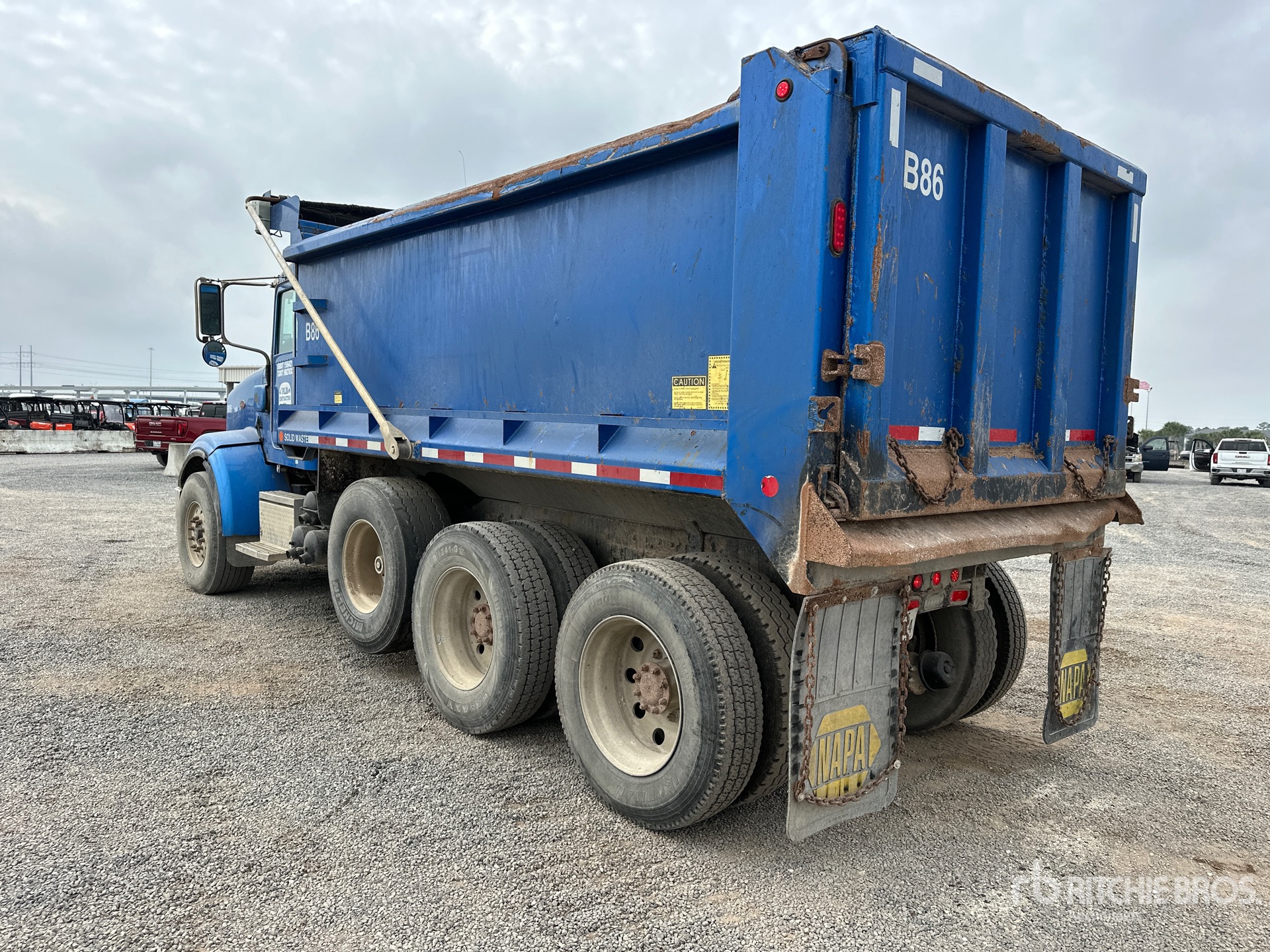 Cummins 6 Cylinder Diesel Engine, 2572.3 Engine hrs, Engine Brake, Allison Automatic Transmission, 20000 lb Front Axle, 46000 lb Rears, 66000 lb GVWR, Air Ride Cab, Aluminum Outer Wheels, 425/65R22.5 Front Tires, 11R24.5 Rear Tires, Air Lift Pusher Axle, Dual Steering Boxes, Air Ride Suspension, 207 in Wheelbase, 16 ft Long x 4 ft 6 in High Steel Body, Electric Roll Tarp