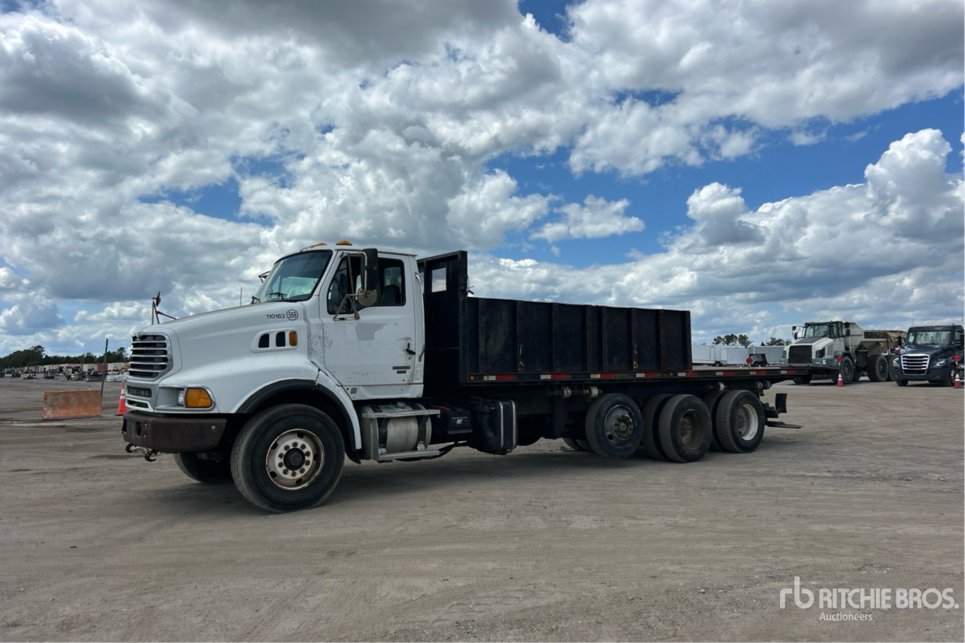Mercedes-Benz MBE4000 6 Cylinder 12.8 L Diesel 410 hp Engine, Eaton Fuller FRO-14210C 10-Speed Manual Transmission, Differential Lock, 18740 lb Front Axle, 40000 lb Rears, 58740 lb GVWR, 385/65R22.5 Front Tires, 11R22.5 Rear Tires, Dual Steering Boxes, Double Frame, Rubber over Walking Beam Suspension, 274 in Wheelbase, PTO, 24 ft 6 in Long Steel Body