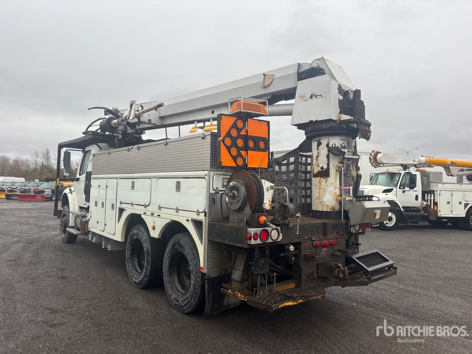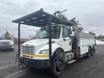 Cummins ISC-285 6 Cylinder Diesel Engine, 8676 Engine hrs, Engine Brake, Allison 3500 Automatic Transmission, Double Differential Locks, 14600 lb Front Axle, 40000 lb Rears, 6.14:1 Axle Ratio, 54600 lb GVWR, Air Ride Cab, 12R22.5, Hendrickson Haulmaax Suspension, 228 in Wheelbase, PTO, 50 ft Sheave Height, 15999 lb Capacity, Rear Mounted, 40 ft Reach, Pole Guide, Boom Tip Mounted Winch, BrandFX 18 ft Body, A-Outriggers, Rear Outriggers, Hydraulic Hose Reel