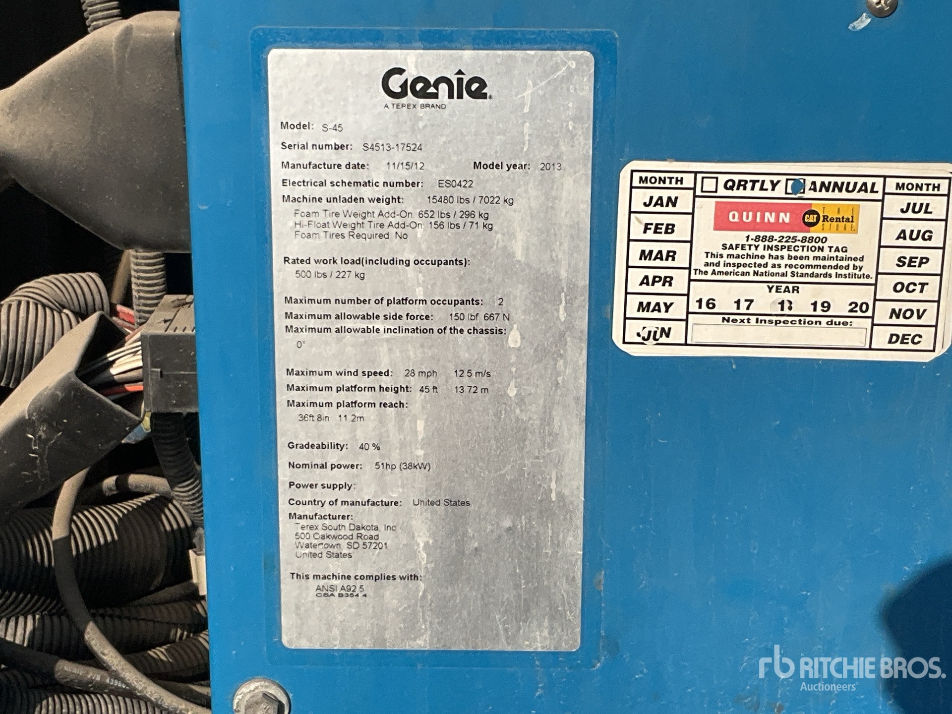 Les informations détaillées de l'équipement ont une portée limitée. Ritchie Bros. Auctioneers n'a inspecté aucun aspect ou composant de l'équipement autre que ceux expressément énoncés dans le présent document. Sauf indication expresse, nous ne faisons aucune déclaration ou garantie, expresse ou implicite, concernant l'équipement et/ou ses composants, y compris, sans s'y limiter, toute déclaration ou garantie concernant le fonctionnement, la conformité à toute norme ou exigence de sécurité de toute autorité ou tout organisme de réglementation applicable, l'adéquation à un usage particulier ou la qualité marchande. Nous vous conseillons fortement d'effectuer vous-même une inspection détaillée de l'équipement avant d'enchérir.