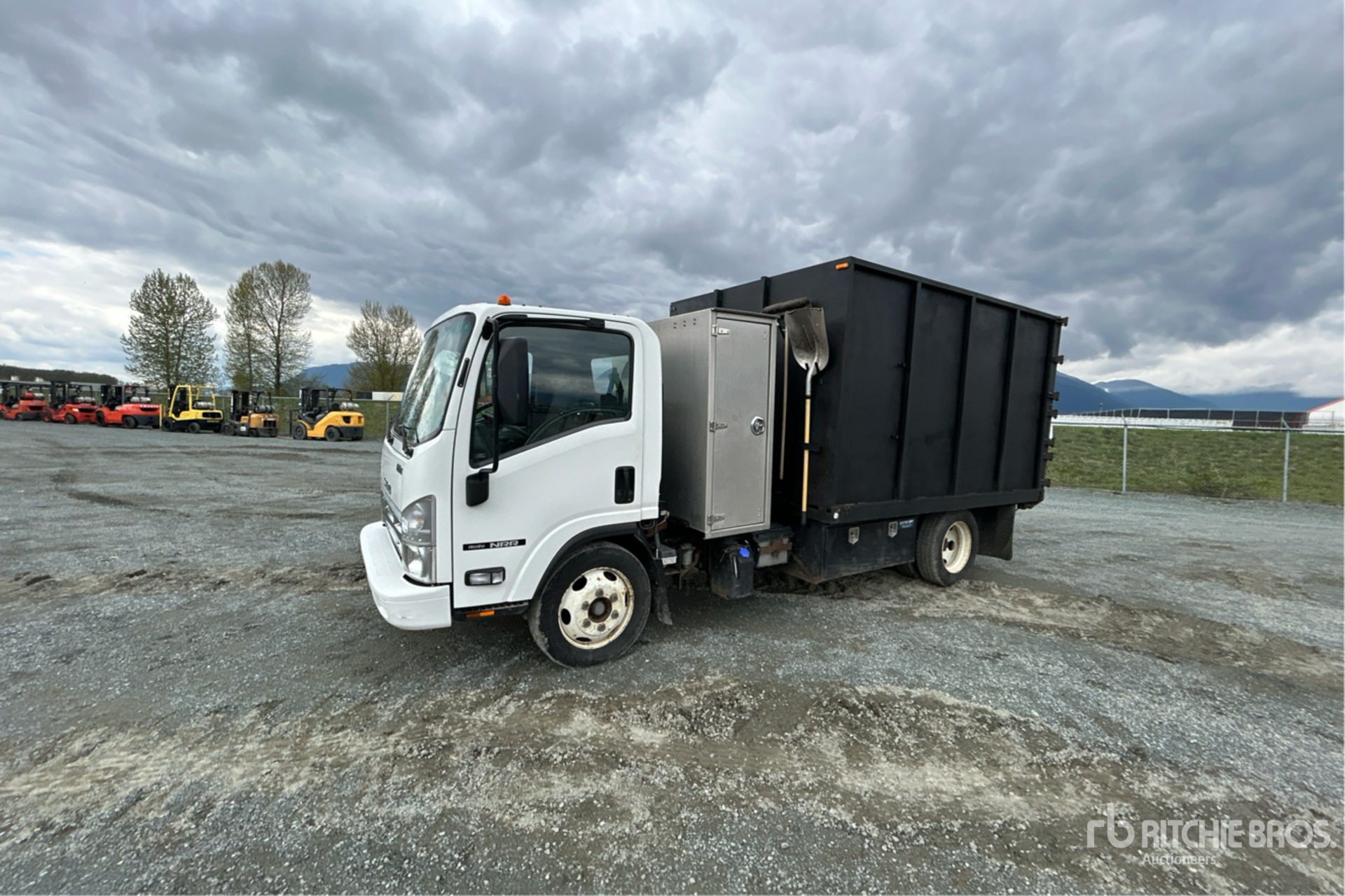 Isuzu 4HKITC 4 Cylinder 317 cid Diesel 210 hp Engine, 2014 US EPA Label, CARB Compliant, 11645 Engine hrs, Automatic Transmission, 7275 lb Front Axle, 13660 lb Rears, 19500 lb GVWR, 225/70R19.5, Spring Suspension, 150 in Wheelbase, 11 ft Long x 6 ft High Steel Body, Split Swing Tailgate