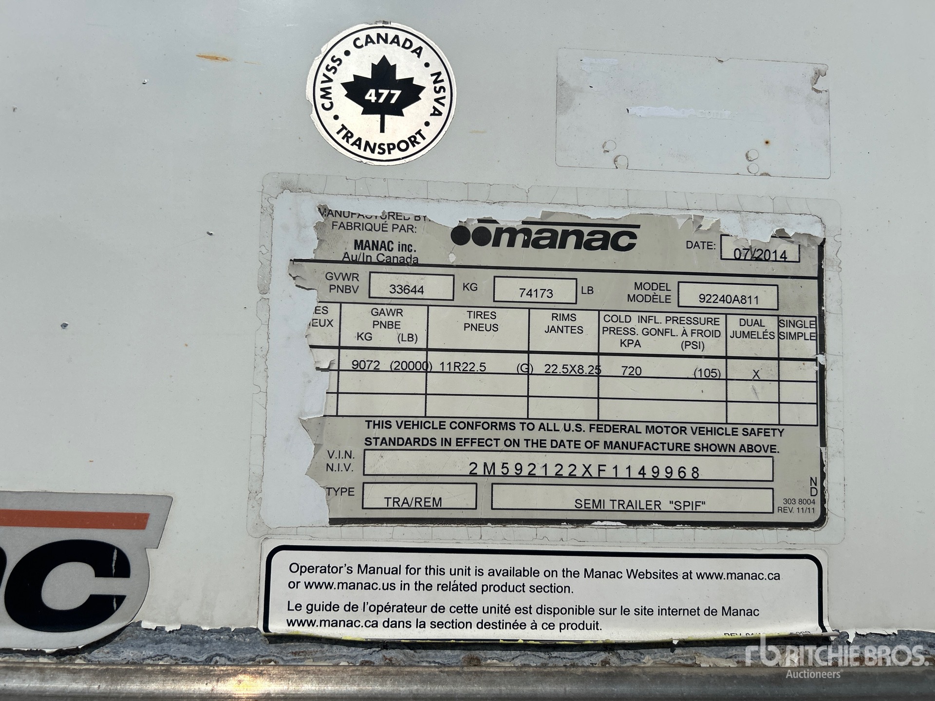 Les informations détaillées de l'équipement ont une portée limitée. Ritchie Bros. Auctioneers n'a inspecté aucun aspect ou composant de l'équipement autre que ceux expressément énoncés dans le présent document. Sauf indication expresse, nous ne faisons aucune déclaration ou garantie, expresse ou implicite, concernant l'équipement et/ou ses composants, y compris, sans s'y limiter, toute déclaration ou garantie concernant le fonctionnement, la conformité à toute norme ou exigence de sécurité de toute autorité ou tout organisme de réglementation applicable, l'adéquation à un usage particulier ou la qualité marchande. Nous vous conseillons fortement d'effectuer vous-même une inspection détaillée de l'équipement avant d'enchérir.