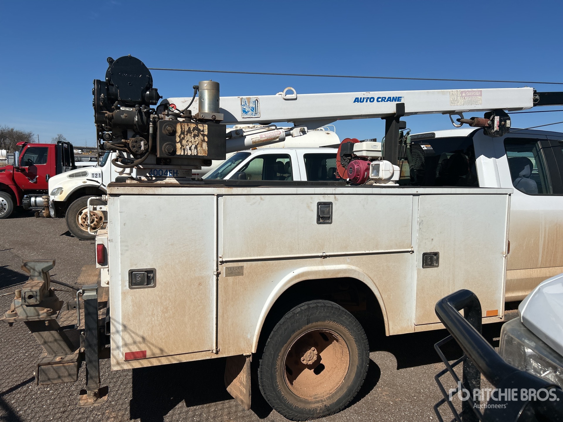 V8 Gasoline Engine, Automatic Transmission, 5200 lb Front Axle, 10040 lb Rears, 14000 lb GVWR, 245/75R17, Spring Suspension, 168 in Wheelbase, RKI L60DW94 9 ft Body, Manual Stabilizers, Auto Crane 4004EH 4000 lb 2 Section Electric Crane, Wired Remote Control, champion HGR7-3H Gasoline Air Compressor, Air Hose Reel