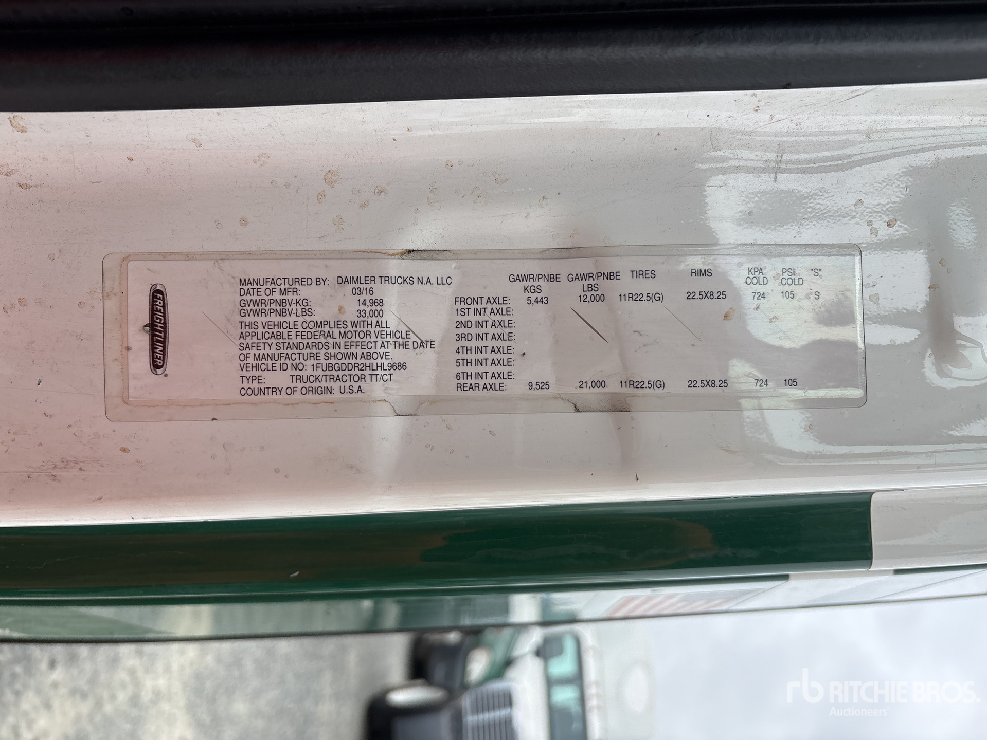 Detroit DD15 455 hp Engine, 2016 US EPA Label, 19506 Engine hrs, Eaton Fuller FRO-15210C 10-Speed Manual Transmission, 12000 lb Front Axle, 21000 lb Rears, 33000 lb GVWR, Engine Brake, 158 in Wheelbase, Air Suspension, 11R22.5, Dual Fuel Tanks
