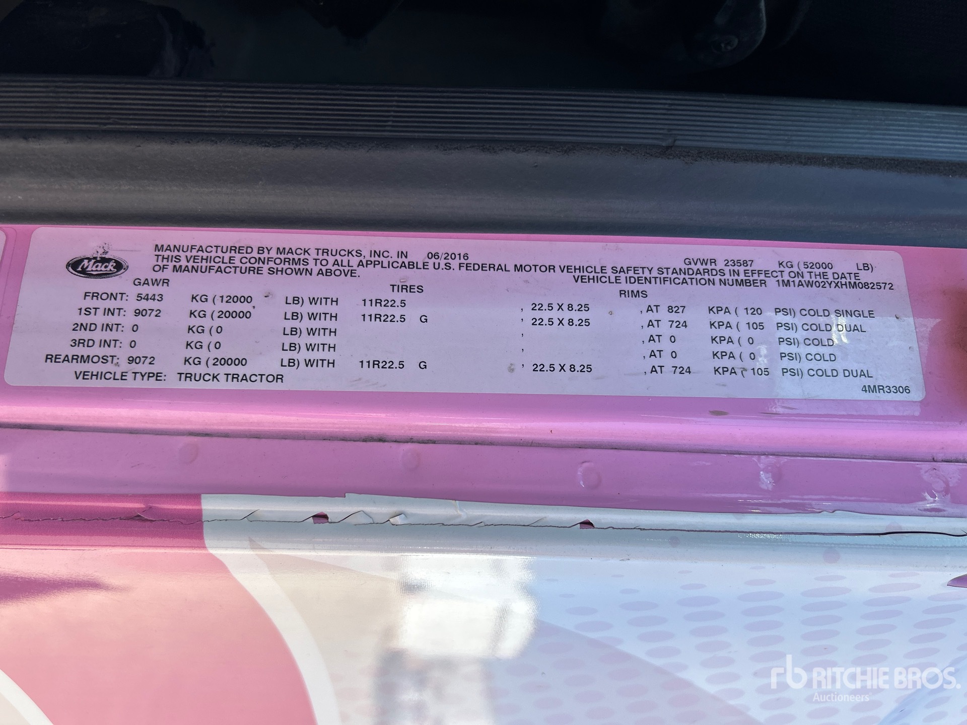 Mack Engine, 2017 US EPA Label, 5399 Engine hrs, Automated Transmission, 12000 lb Front Axle, 40000 lb Rears, 52000 lb GVWR, Engine Brake, 182 in Wheelbase, Air Suspension, Aluminum Wheels, 11R22.5 Front Tires, 295/75R22.5 Rear Tires, Air Sliding 5th Wheel, Dual Fuel Tanks