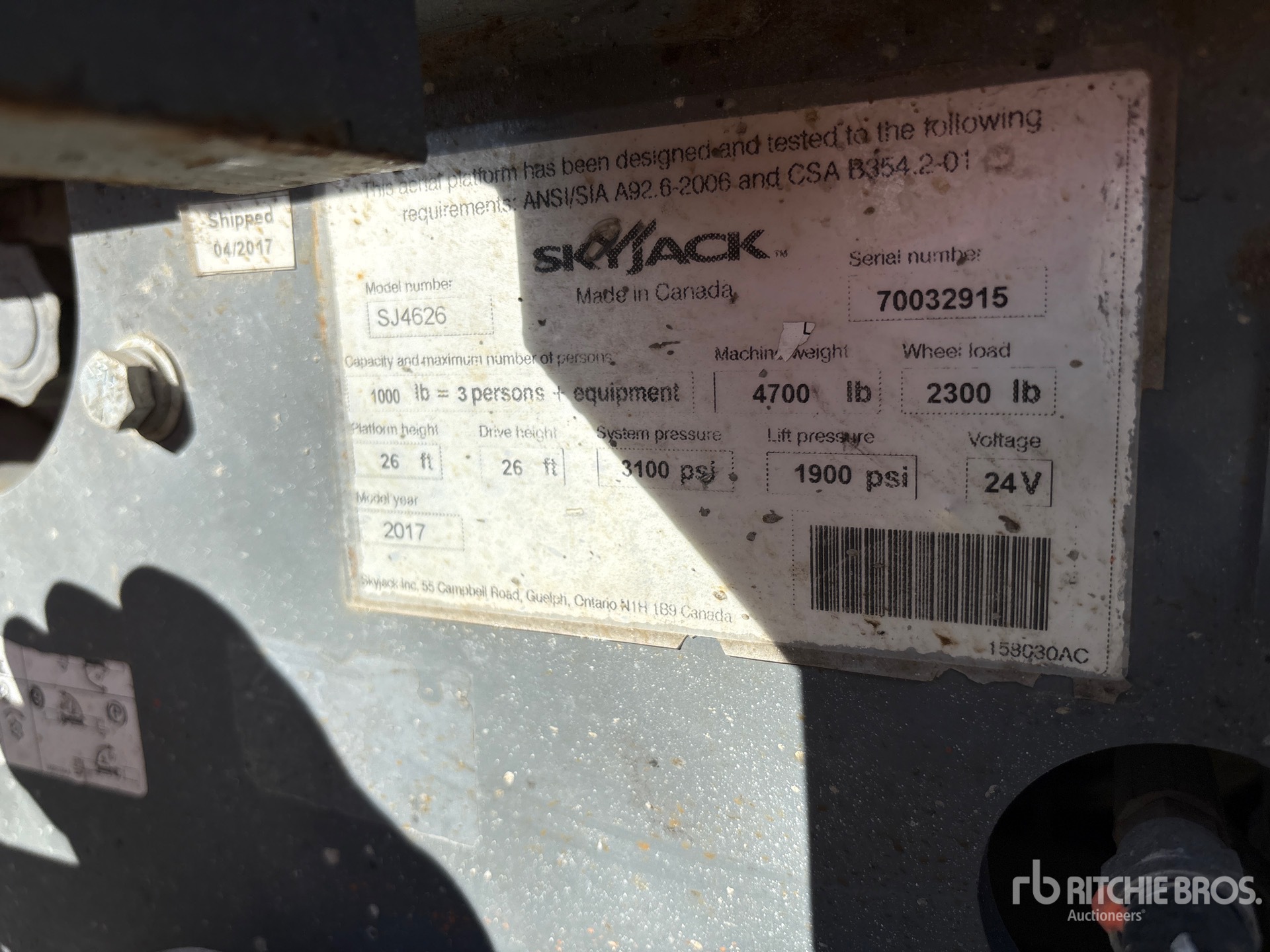 Les informations détaillées de l'équipement ont une portée limitée. Ritchie Bros. Auctioneers n'a inspecté aucun aspect ou composant de l'équipement autre que ceux expressément énoncés dans le présent document. Sauf indication expresse, nous ne faisons aucune déclaration ou garantie, expresse ou implicite, concernant l'équipement et/ou ses composants, y compris, sans s'y limiter, toute déclaration ou garantie concernant le fonctionnement, la conformité à toute norme ou exigence de sécurité de toute autorité ou tout organisme de réglementation applicable, l'adéquation à un usage particulier ou la qualité marchande. Nous vous conseillons fortement d'effectuer vous-même une inspection détaillée de l'équipement avant d'enchérir.