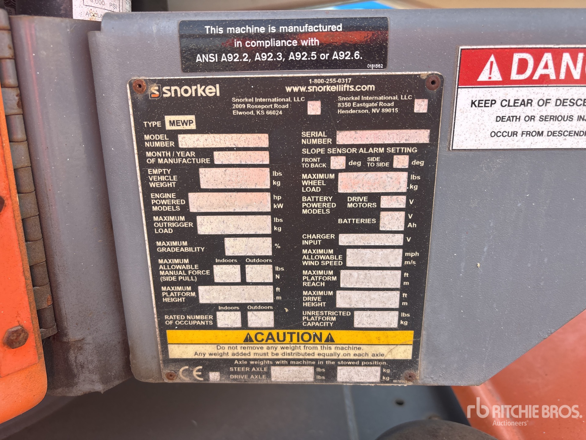 L'équipement n'a pas été testé avec charge ou utilisé dans toutes les situations applicables. Nous ne garantissons en aucun cas le bon fonctionnement de l'équipement conformément aux spécifications du fabricant. Aucune inspection n'a été effectuée pour vérifier tout aspect fonctionnel, sauf indication expresse dans le présent document. Seule une sélection de photos des composants individuels du train roulant sont à disposition, et peut ne pas indiquer l'état de l'ensemble de celui-ci.