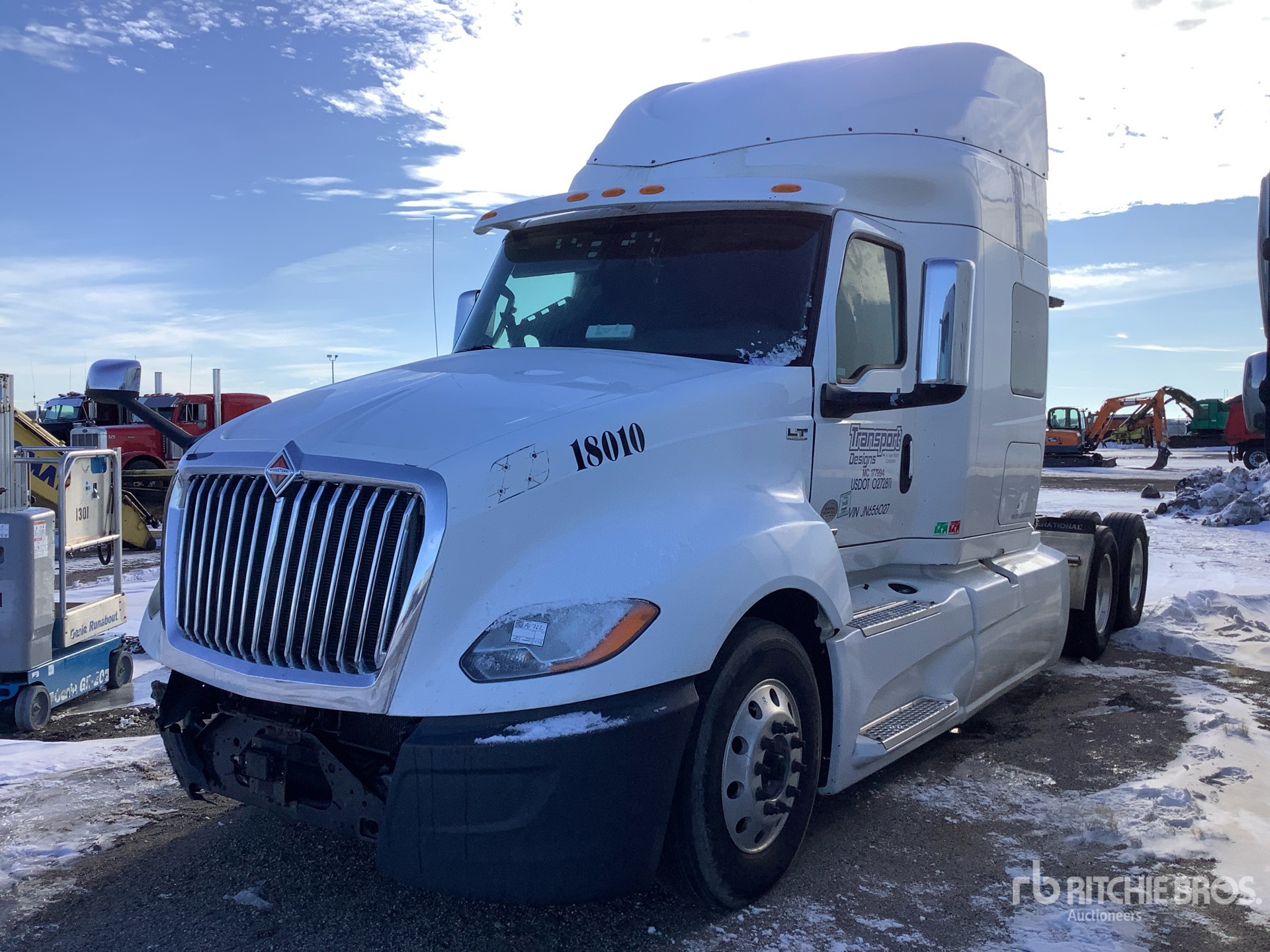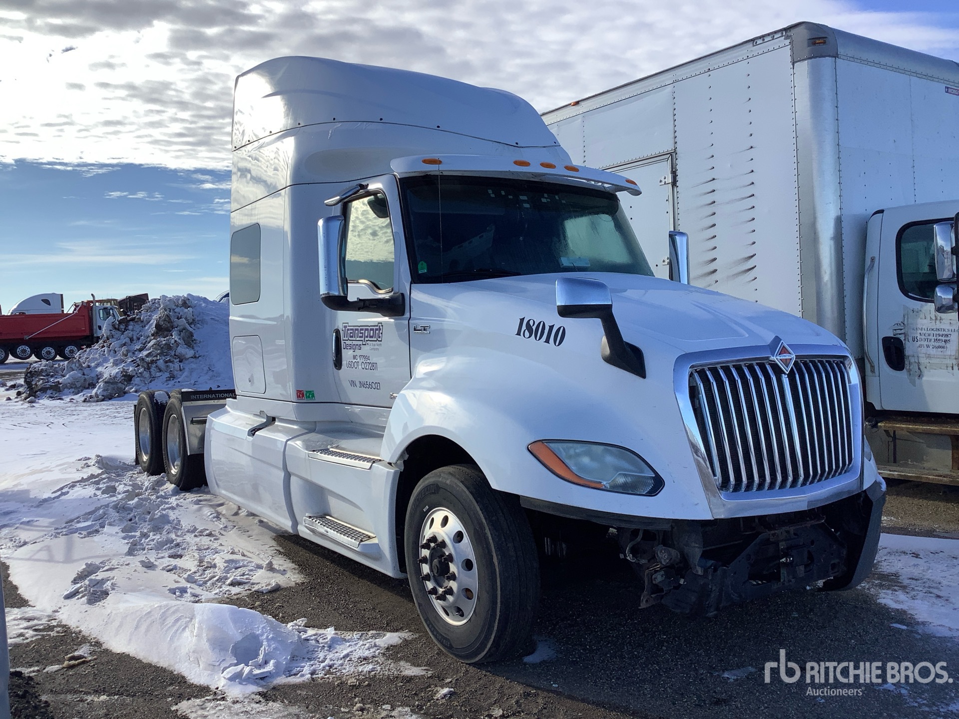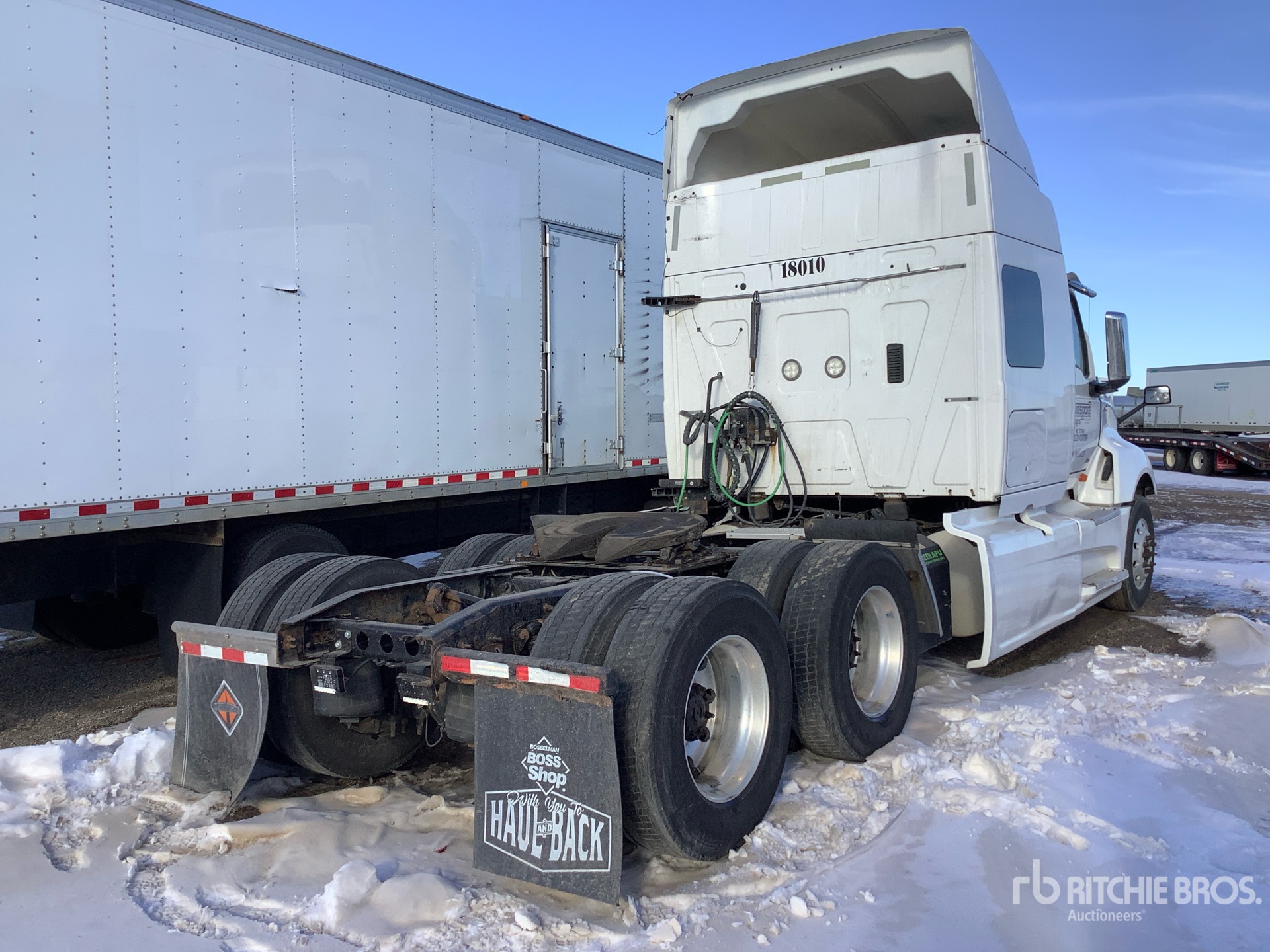 Located in Spot 27, International Engine, Eaton Fuller 13-Speed Manual Transmission, 13200 lb Front Axle, 40000 lb Rears, 53200 lb GVWR, Engine Brake, 72 in Mid Roof Sleeper Cab, Bunk Beds, Bunk Heater, Auxiliary Power Unit, 234 in Wheelbase, Air Suspension, Aluminum Wheels, 275/80R22.5 Front Tires, 295/75R22.5 Rear Tires, Dual Fuel Tanks