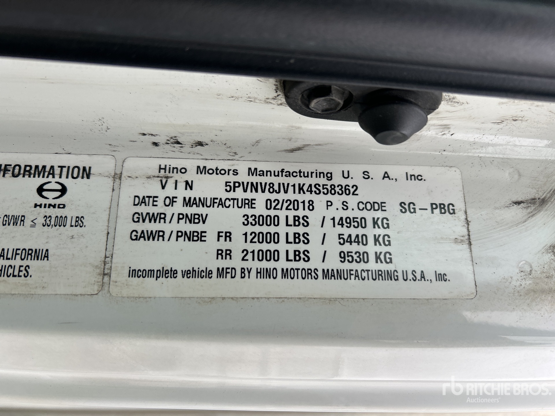 Located in Lane 39 Spot 25, Hino Motors J08E-VB 6 Cylinder 7.7 L Diesel 260 hp Engine, 2018 US EPA Label, Requires Diesel Exhaust Fluid, Automatic Transmission, 12000 lb Front Axle, 21000 lb Rears, 33000 lb GVWR, 11R22.5, Air Ride Suspension, 272 in Wheelbase, Supreme 26 ft x 102 in Wide x 103 in High Body, Liftgate, Professionally-Maintained-Fleet-Vehicle-PAG