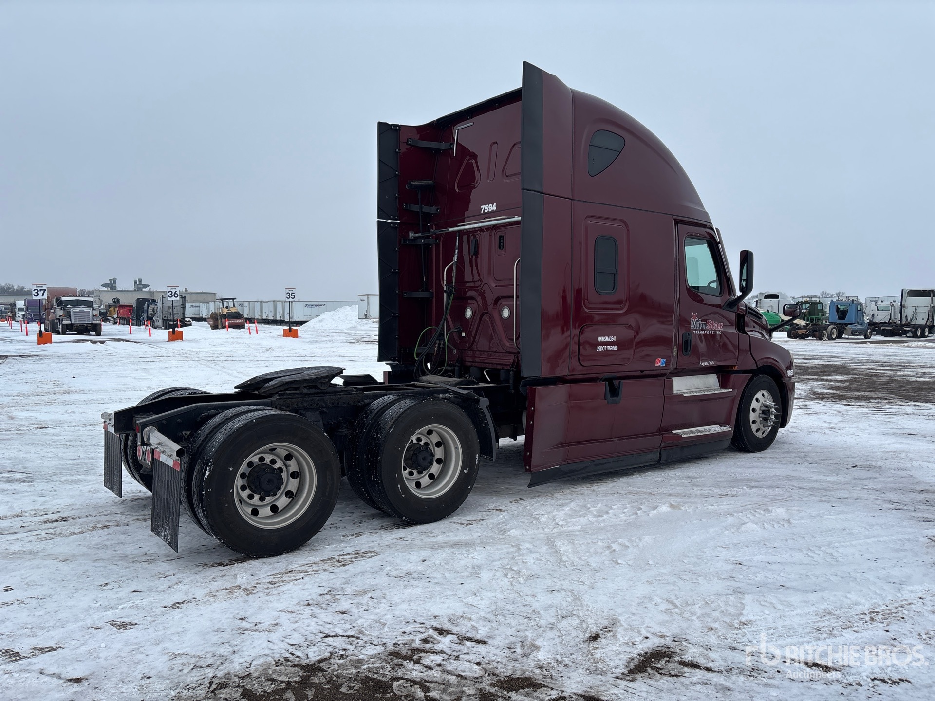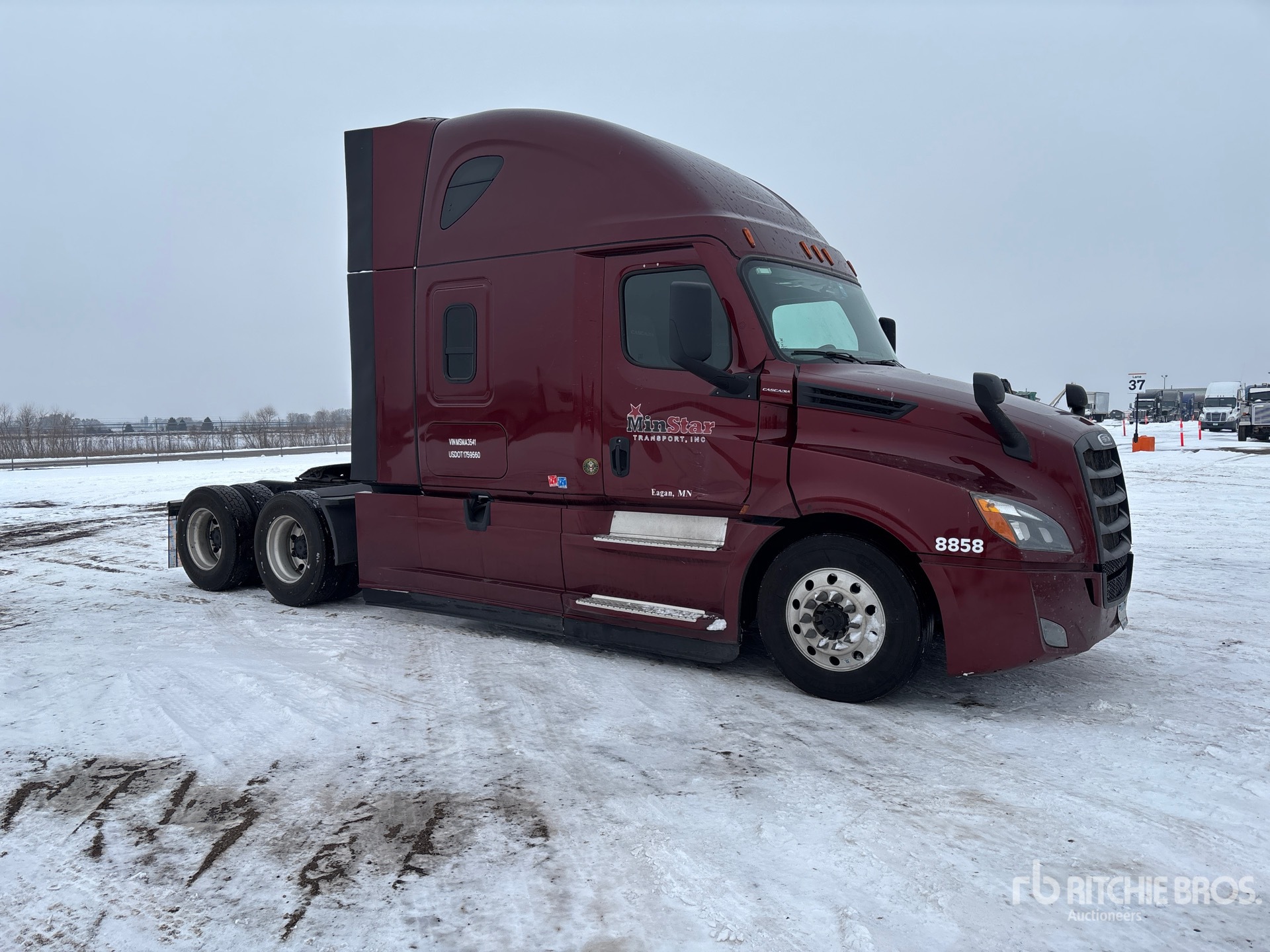 Located in Lane 6 Spot 5, Detroit DD15 475 hp Engine, 2020 US EPA Label, 22393 Engine hrs, Detroit DT12-1650-OH1 12-Speed Automated Transmission, 12500 lb Front Axle, 40000 lb Rears, 52500 lb GVWR, Engine Brake, 70 in High Rise Sleeper Cab, Bunk Beds, 223 in Wheelbase, Air Suspension, Aluminum Wheels, 275/80R22.5 Front Tires, 295/75R22.5 Rear Tires, Air Sliding 5th Wheel, Dual Fuel Tanks