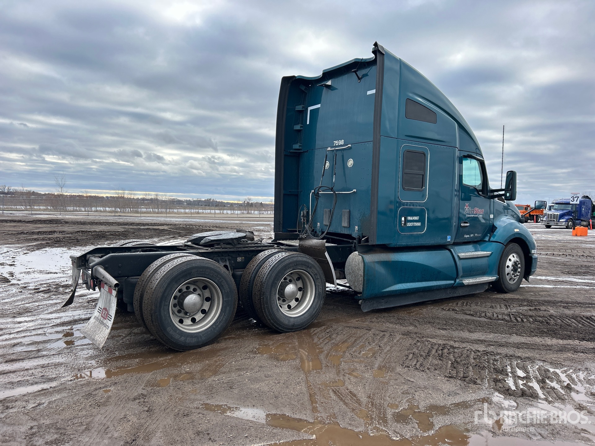 Located in Lane 26 Spot 51, Paccar MX-13 455 hp Engine, 2020 US EPA Label, 23326 Engine hrs, Eaton Fuller 10-Speed Manual Transmission, 12350 lb Front Axle, 40000 lb Rears, 52350 lb GVWR, Engine Brake, 62 in High Rise Sleeper Cab, Bunk Beds, 233 in Wheelbase, Air Suspension, Aluminum Outer Wheels, 275/80R22.5, Air Sliding 5th Wheel, Dual Fuel Tanks