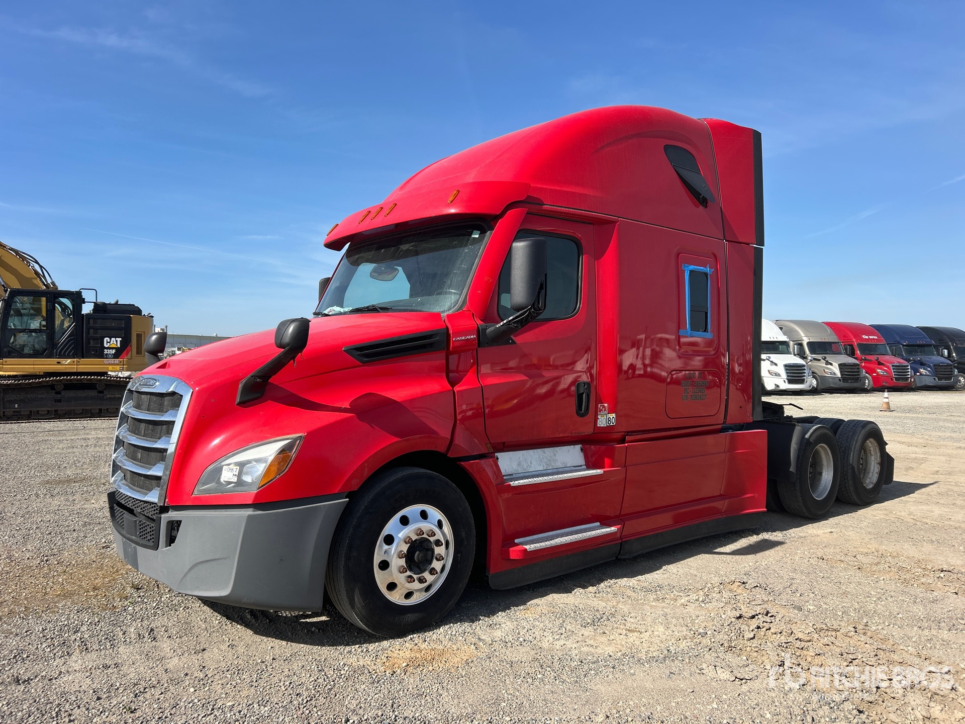 Left fender paint damaged, Right fender cracked, Left door damaged, Left lower cab extender damaged, Right lower cab extender missing, Right upper cab extender damaged, Left rear tank skirt cracked, Both right cab extenders trim tabs missing, Left lower cab extender lower trim missing, Right middle/rear skirt trim tab damaged, Both sides sleeper lower trim damaged