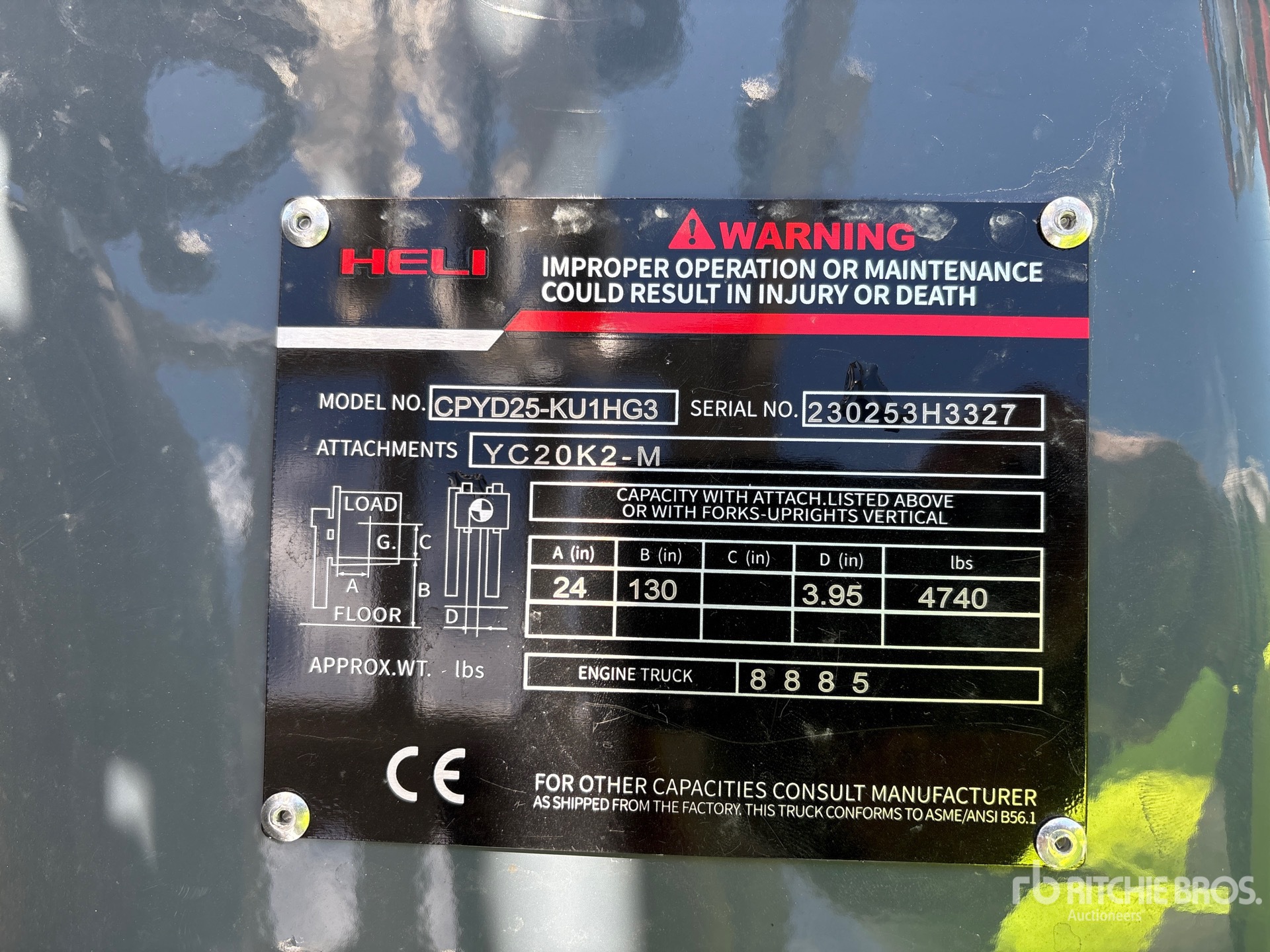 Les informations détaillées de l'équipement ont une portée limitée. Ritchie Bros. Auctioneers n'a inspecté aucun aspect ou composant de l'équipement autre que ceux expressément énoncés dans le présent document. Sauf indication expresse, nous ne faisons aucune déclaration ou garantie, expresse ou implicite, concernant l'équipement et/ou ses composants, y compris, sans s'y limiter, toute déclaration ou garantie concernant le fonctionnement, la conformité à toute norme ou exigence de sécurité de toute autorité ou tout organisme de réglementation applicable, l'adéquation à un usage particulier ou la qualité marchande. Nous vous conseillons fortement d'effectuer vous-même une inspection détaillée de l'équipement avant d'enchérir.
