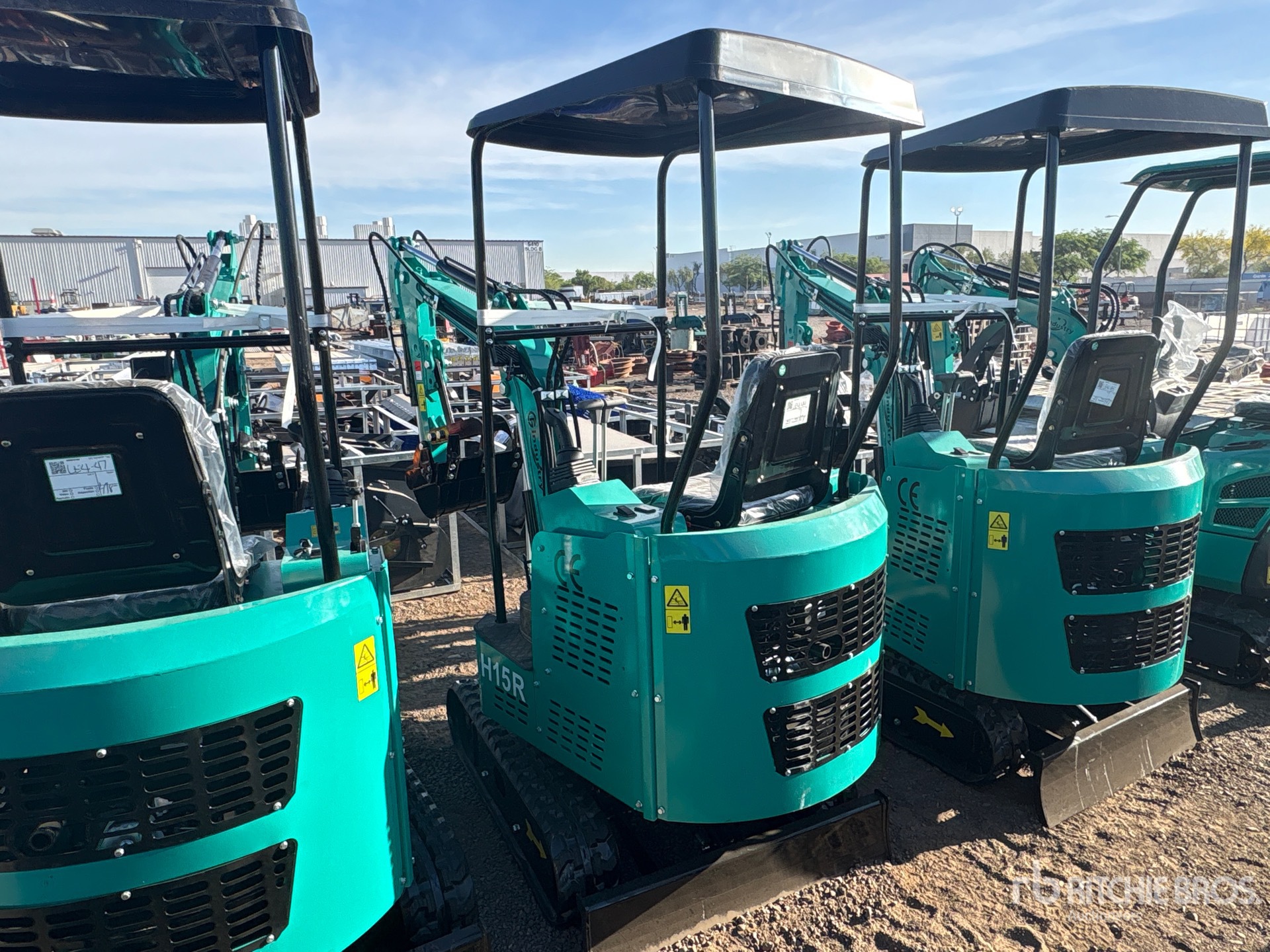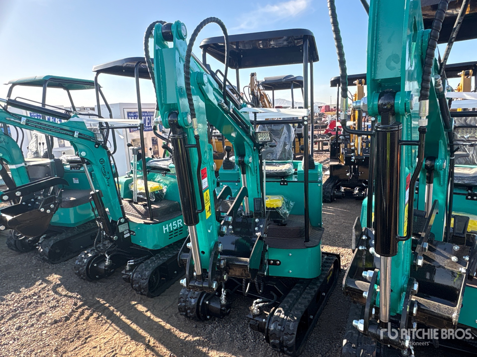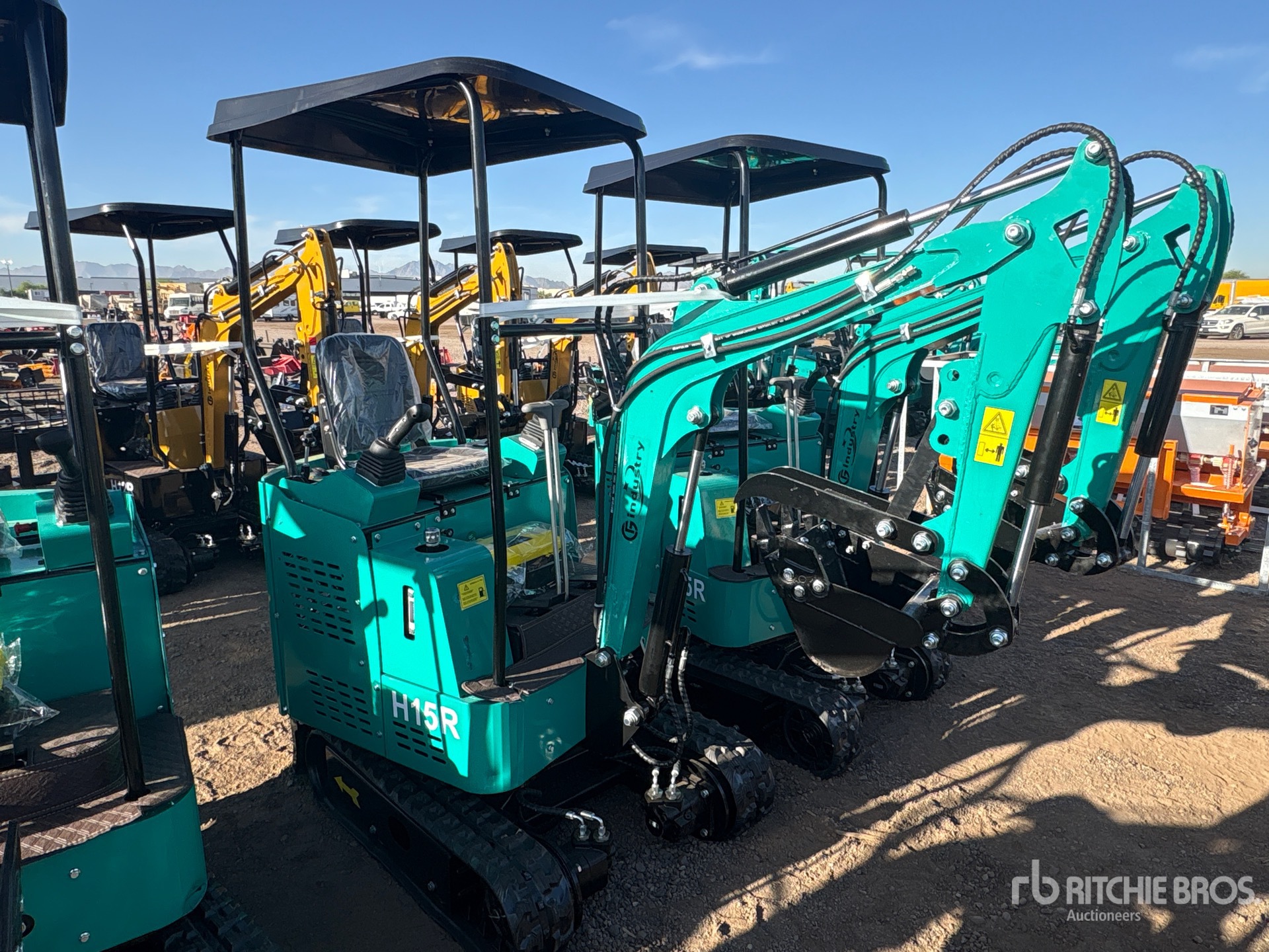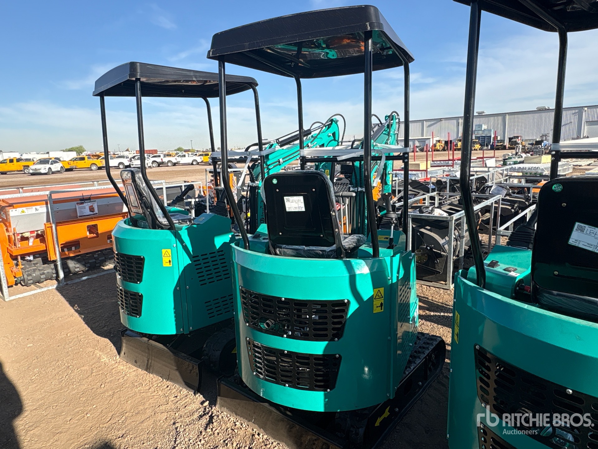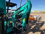 2025 US EPA Label, 2 ft 6 in Stick, Auxiliary Hydraulic Plumbing, Backfill Blade, 7 in Rubber Tracks, 17 in Digging Bucket, Manual Thumb, Item is new/unused.