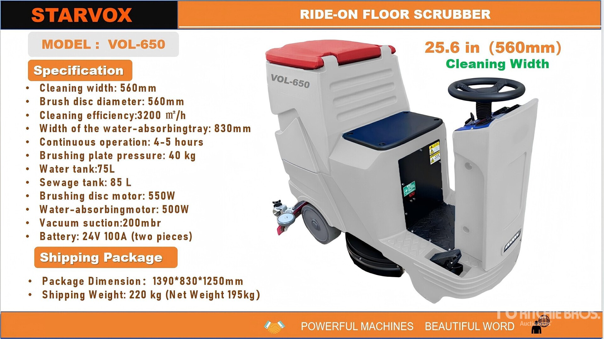 25 in Working Width, Water System, Rear Squeegee, 24 Volt Operating System, Product images displayed are stock photos. Item is new/unused.