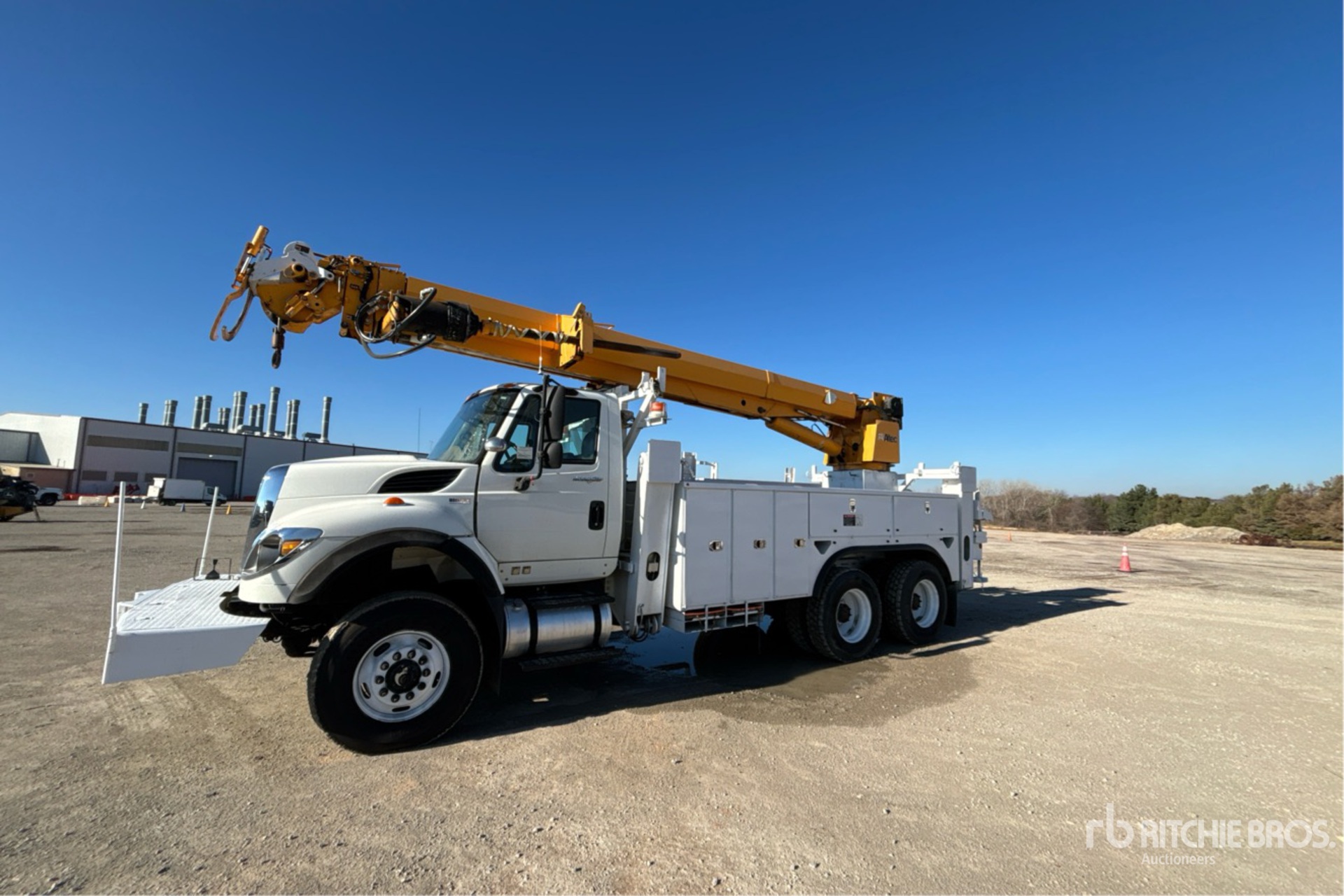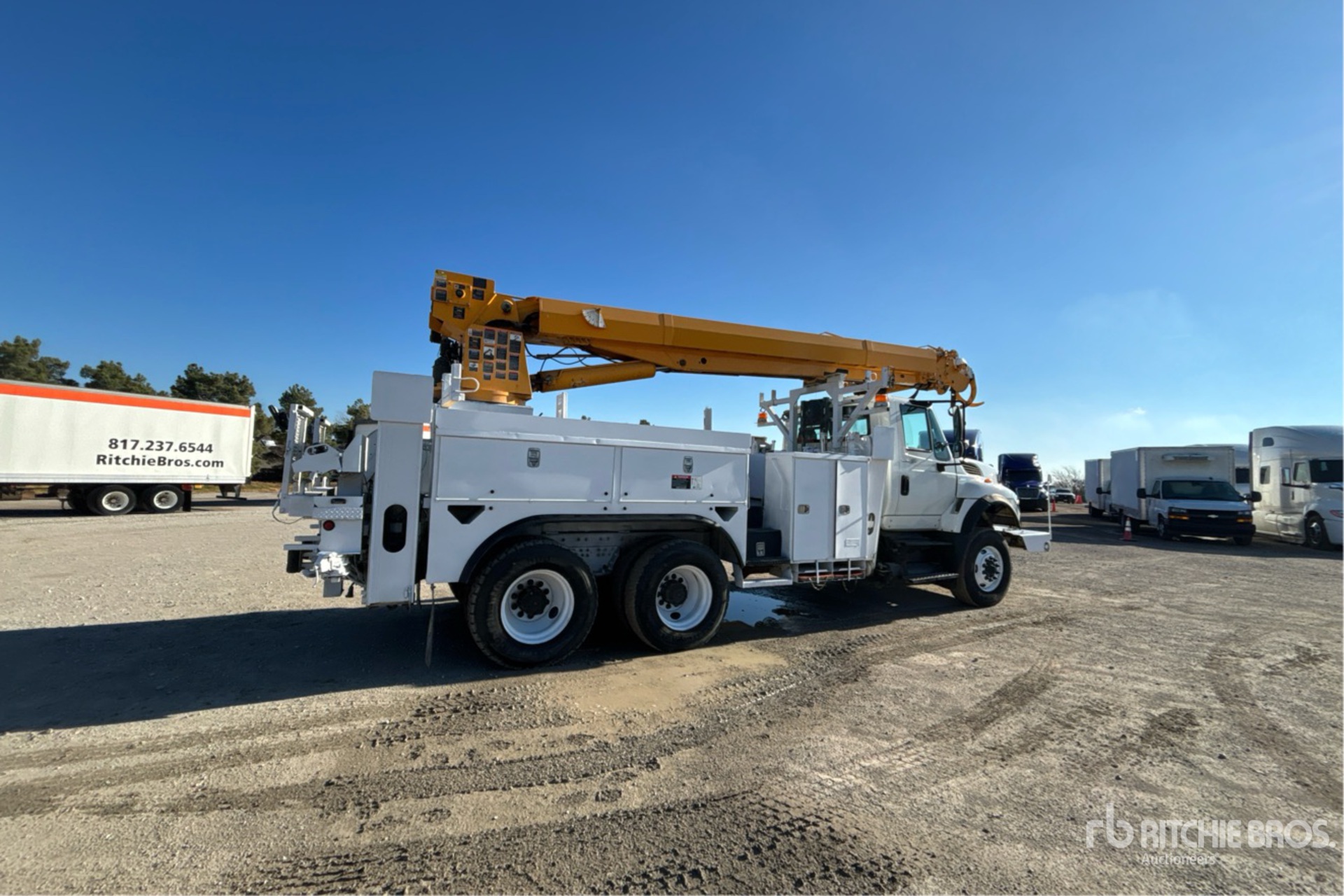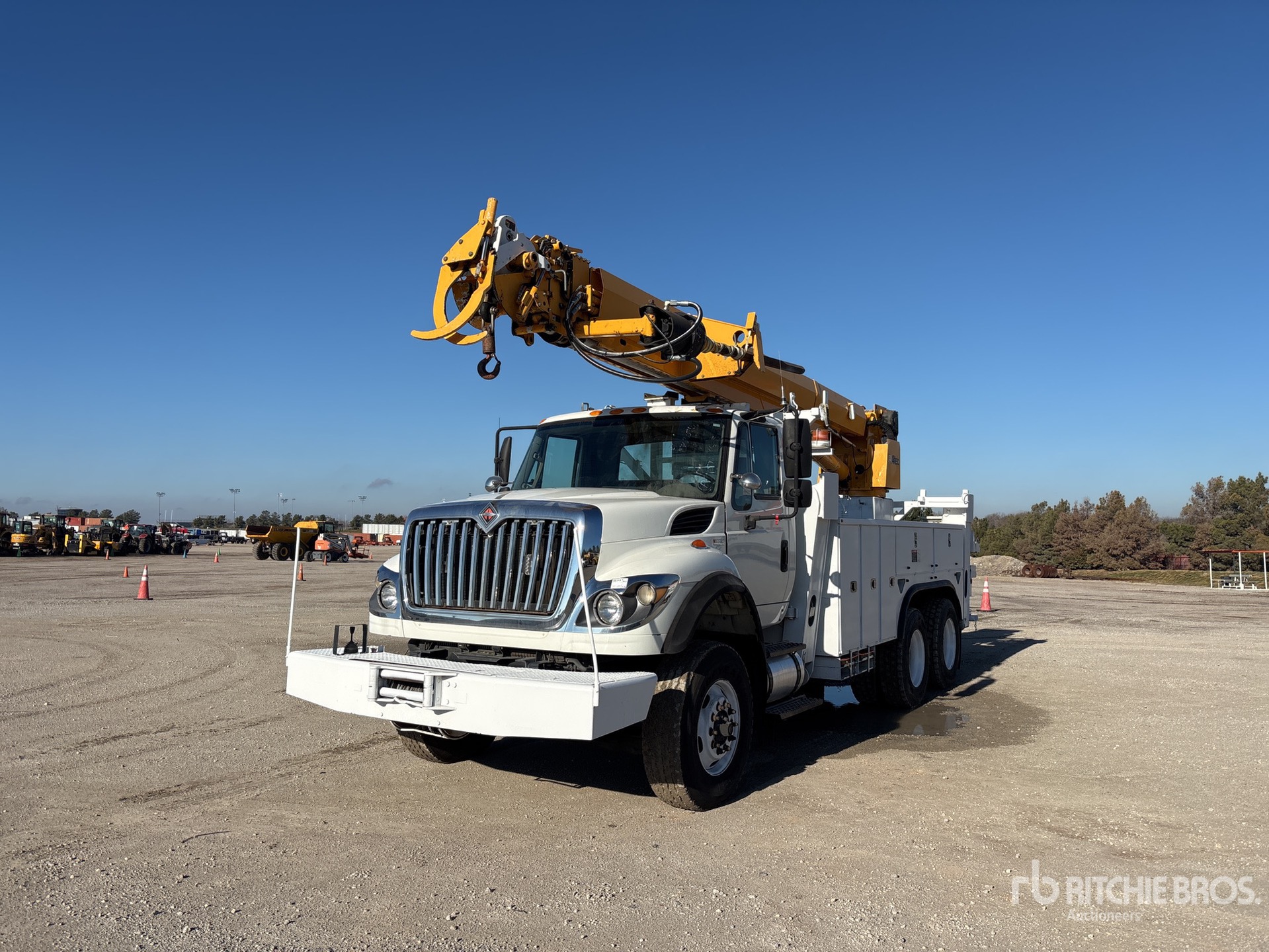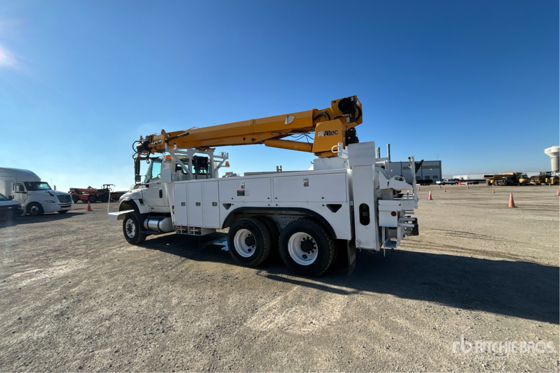 Located in Lane 48 Spot 3, Diesel Engine, Eaton Fuller 8-Speed Manual Transmission, 18000 lb Front Axle, 40000 lb Rears, 58000 lb GVWR, 315/80R22.5 Front Tires, 11R22.5 Rear Tires, Dual Steering Boxes, Rubber over Walking Beam Suspension, 208 in Wheelbase, 15000 lb Capacity, Rear Mounted, 45 ft Reach, 3 in Auger, Altec 20 ft Body, Straight Down Outriggers, Hydraulic Hose Reel