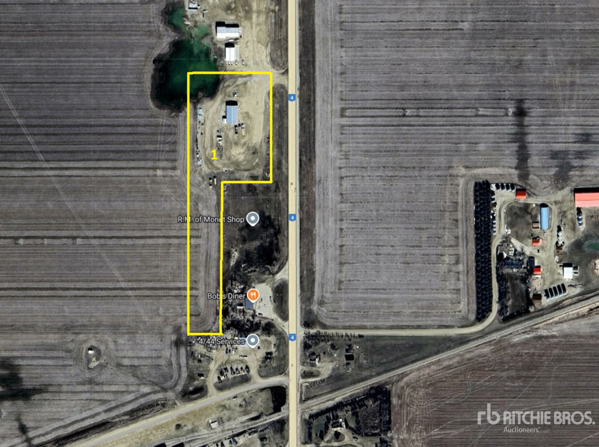4000± sq ft shop, 50 ft x 80 ft, (2) 14x18 ft overhead doors, concrete floors, in-floor sump, (4) overhead heaters, 200 amp electrical, gravelled yard, Hwy 4 frontage., Block AA Plan 102135282. This property is being sold by Ritchie Bros. on behalf of RM of Monet.